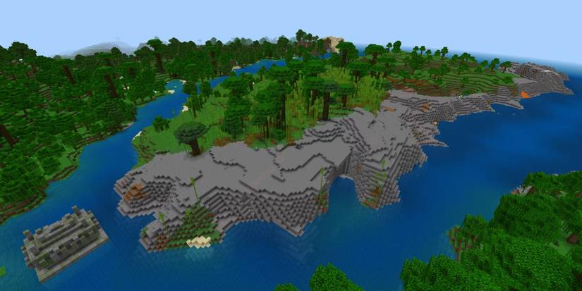 I just found this amazing seed! You start on an island with a really cool jungle – it’s full of bamboo that grows super fast. The island isn’t far from the mainland, just a little bit of water to cross, and there’s tons of flat land perfect for building. What’s awesome is you get both jungle and grassland, so you can tame ocelots to keep creepers away, have fun with parrots, and even grow melons and cocoa beans. It’s a great spot to start a survival world!
