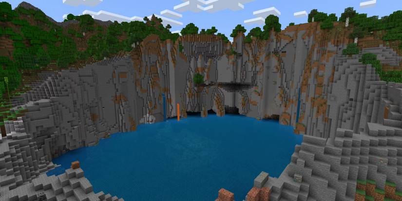 A Reddit user, u/Rusty_Amunition, discovered a Minecraft seed that places you close to a cool landmark: a big, deep lake ringed by rocky hills. This lake is actually considered a Lukewarm Ocean biome, meaning you’ll find fish, squid, and even dolphins swimming around – which is pretty unusual, especially if you don’t normally find oceans near your starting point.