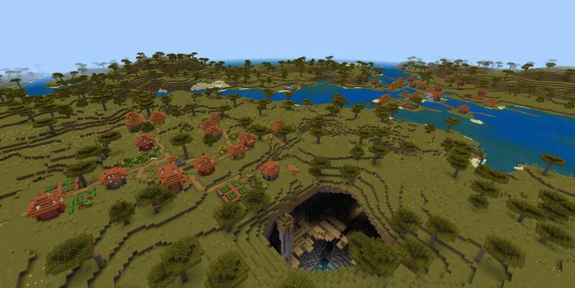 This Minecraft seed places you right in the heart of a Savannah biome, near two large Savannah Villages that are close enough to walk between. While both villages are currently empty, you can easily bring them back to life using Creative Mode or by curing Zombie Villagers. These villages are centered around farming, giving you plenty of food to get started and stay healthy in your early game.