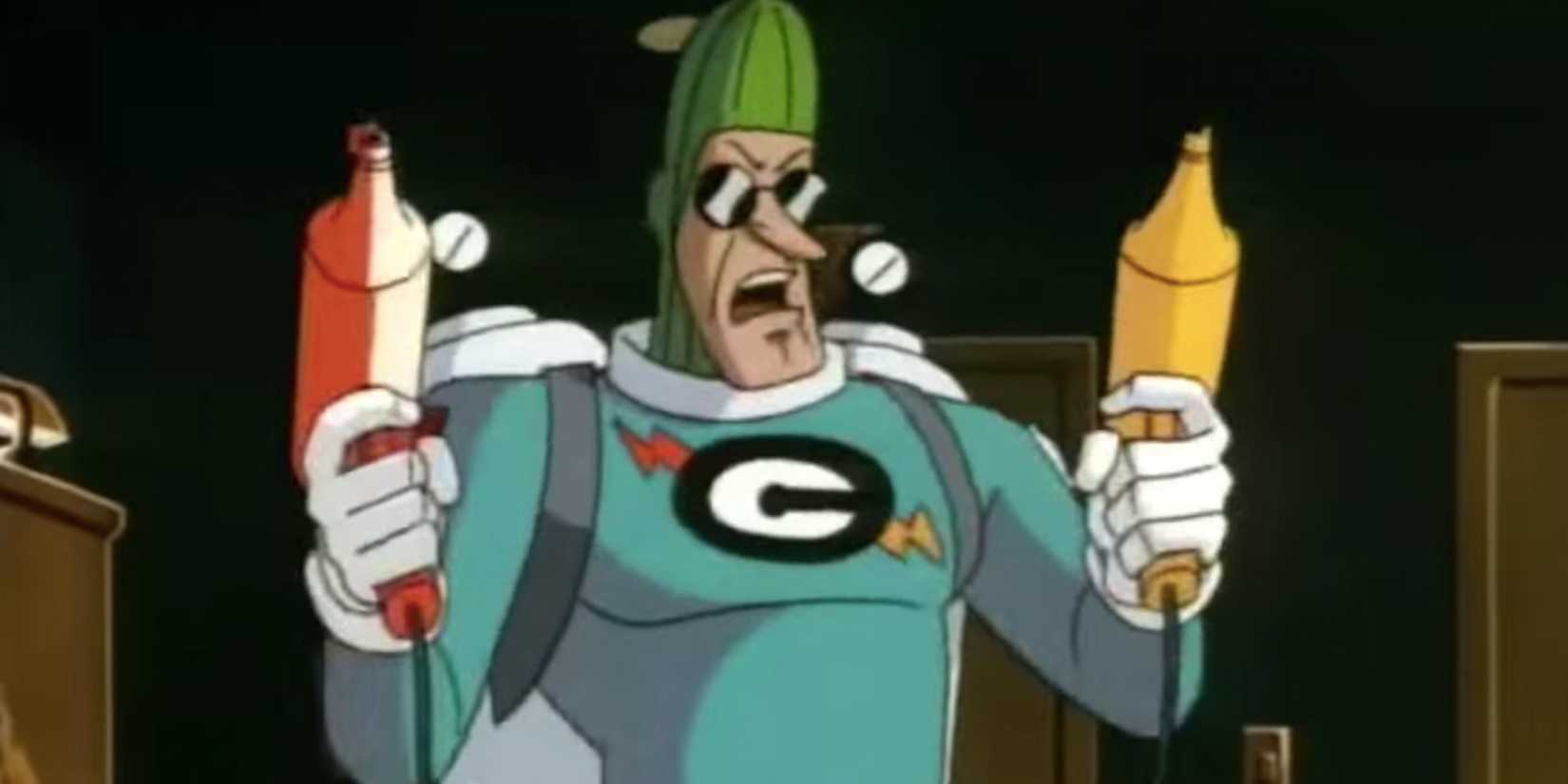 Condiment King has become a surprisingly popular and funny villain in the DC universe. He often shows up in comedic stories, Lego games, and stories that playfully acknowledge their own silliness. But his beginnings are in Batman: The Animated Series, specifically season 2, episode 6, titled “Make ’Em Laugh.” The character was deliberately over-the-top – a criminal who shoots ketchup and mustard as his weapons.