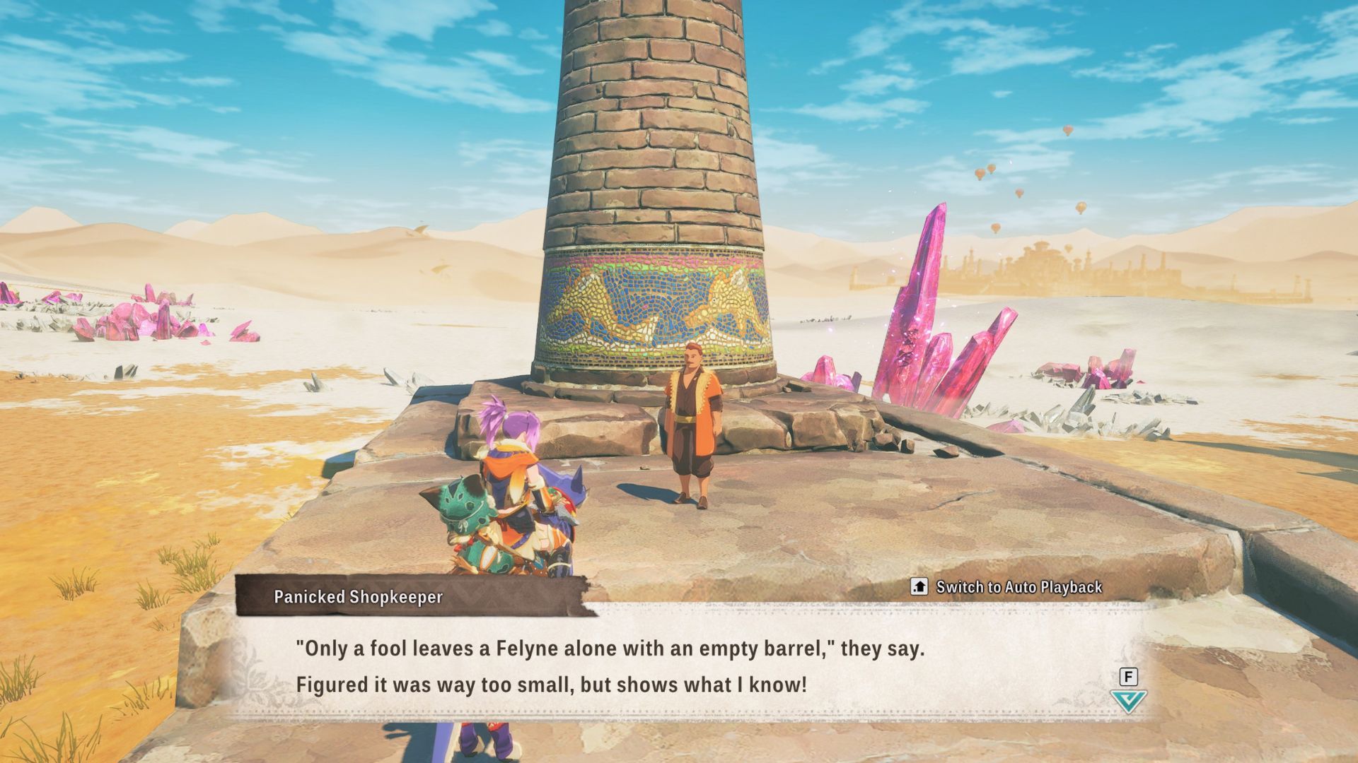 | The Path to Culinary Meowstery 2 | Complete The Path to Culinary Meowstery 1. Talk to the Felyne in the Bountiful Dunes’ oasis while partnered with Eleanor. Travel to a campsite and cook Bubbling Magma Stew, then talk to the Felyne again. |