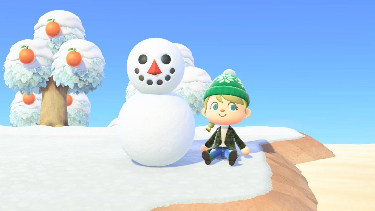 Okay, so imagine your beautiful island gets completely covered in snow – it’s amazing! The first thing I always do is build a snowman. During the winter, you start finding these little snowballs lying around, and it’s so fun! You just stand behind one and walk forward to push it, and it rolls and gets bigger and bigger – that’s how you make the base for your snowman!