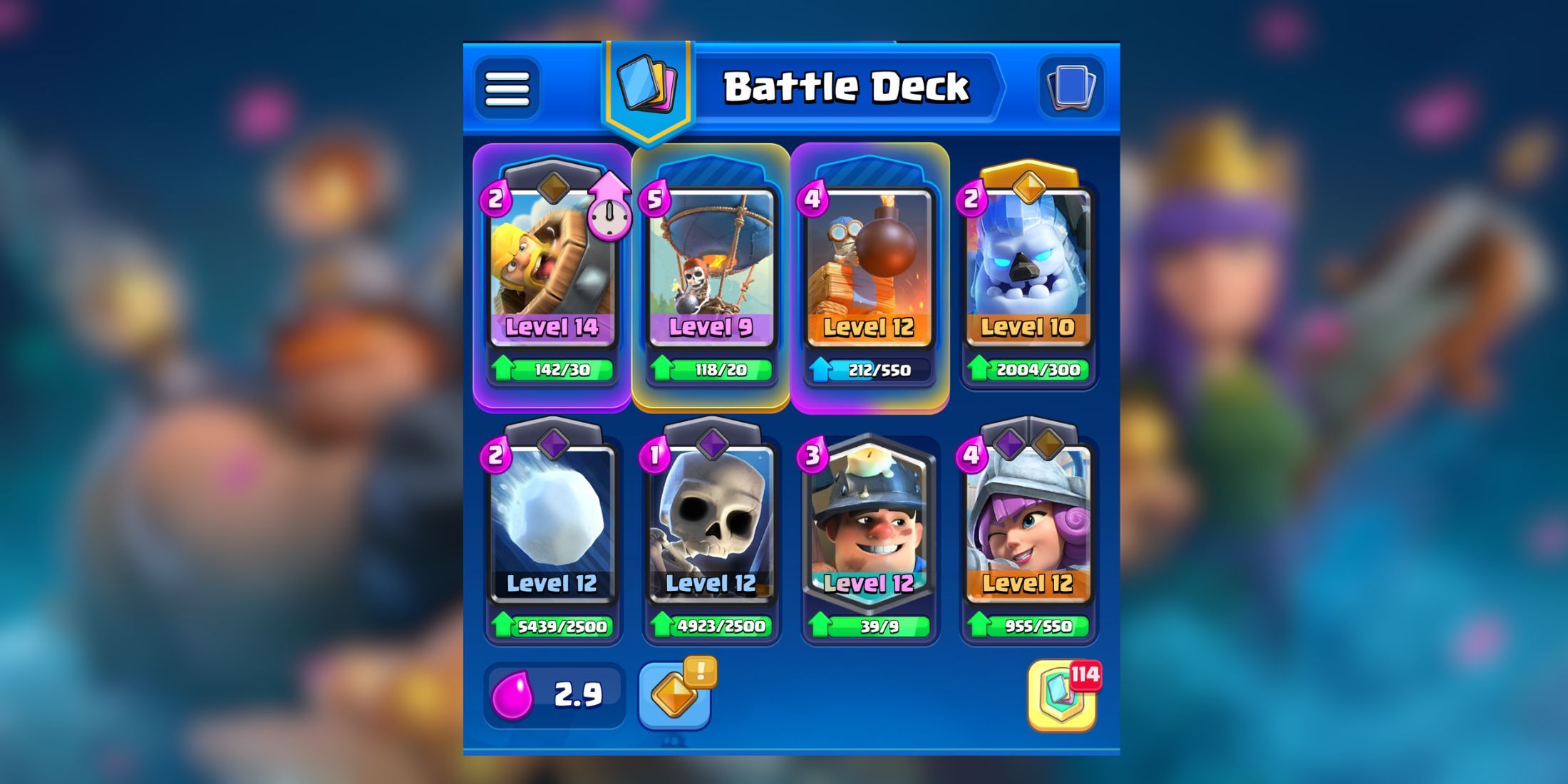 This Balloon deck is well-rounded and focuses on getting your Balloon to the enemy tower. The Miner draws enemy troops away, allowing the Balloon to attack, while the Ice Golem protects it by absorbing damage.