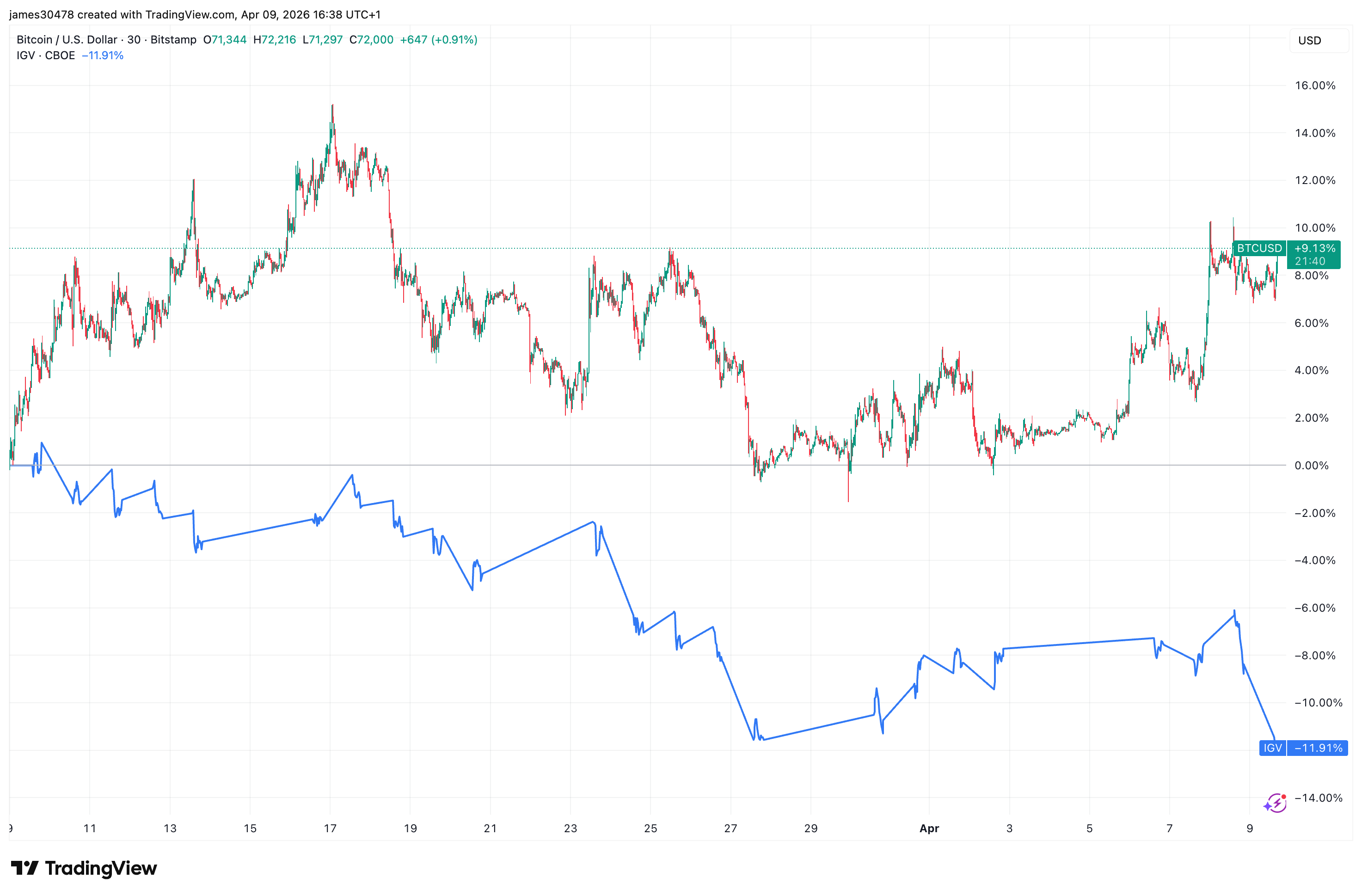 Bitcoin and software stocks, which have often moved in the same direction recently, continued to separate on Thursday. The iShares Expanded Tech-Software ETF (IGV) dropped 4%, nearing a crucial support level of around $76 – a price point it has bounced back from several times in the past.
