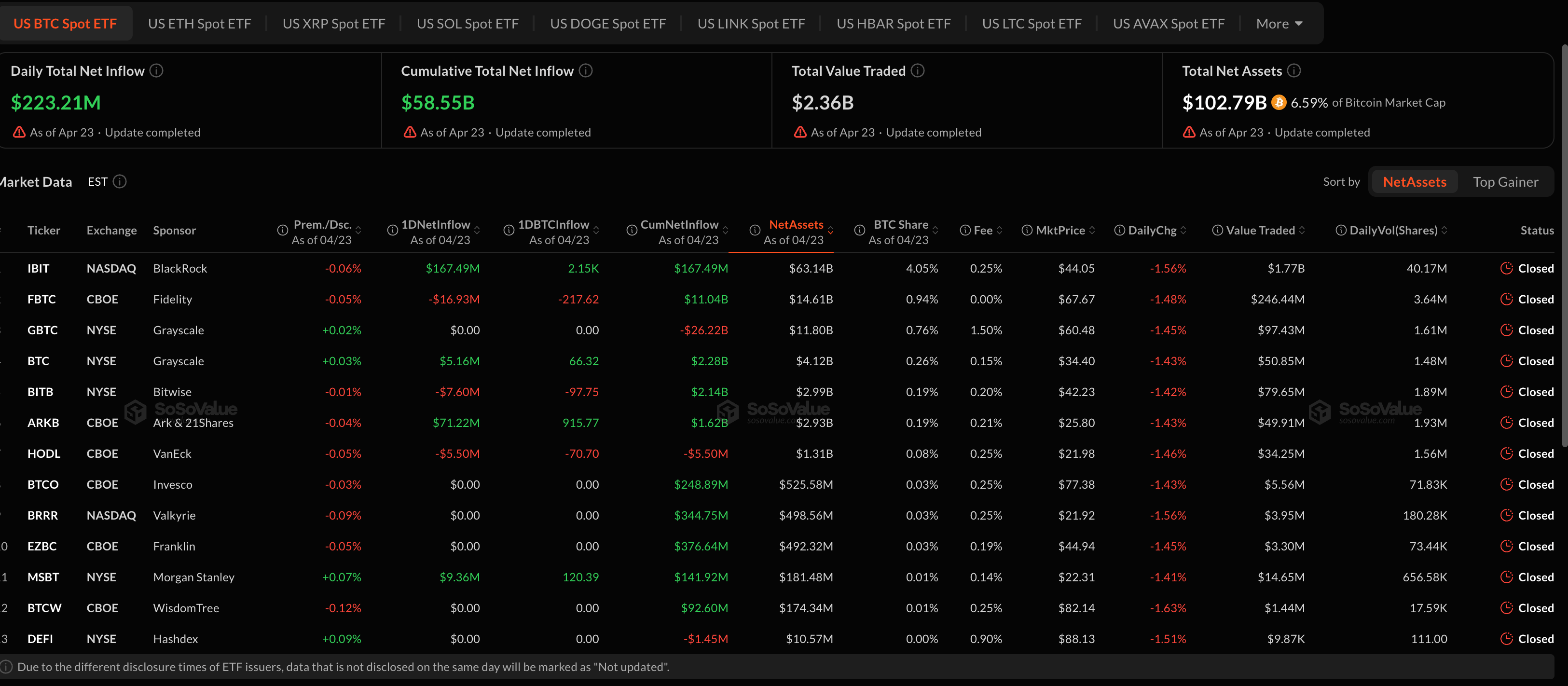 Eight days of inflows, a streak reminiscent of October 2025, when bitcoin kissed $126,000. April 23 alone saw $223.21 million, with BlackRock’s IBIT leading the charge at $167.49 million. Fidelity’s FBTC, the lone dissenter, shed $16.93 million. A symphony of numbers, each note a decision, each decision a gamble.