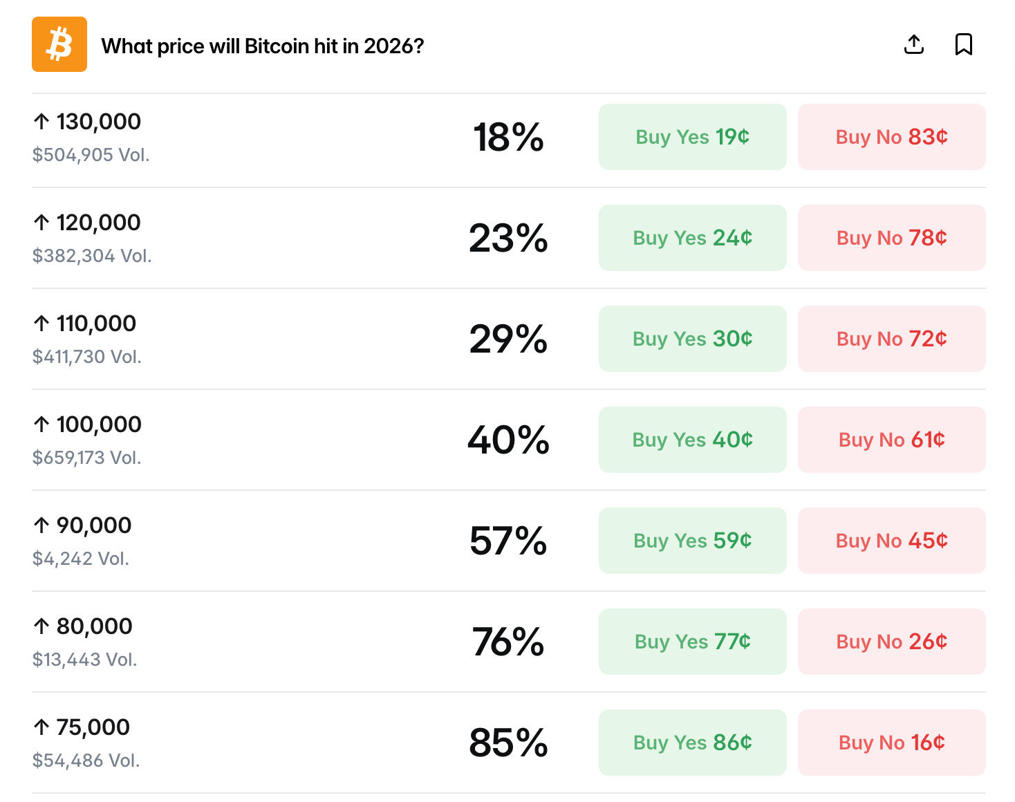 The highest implied probability is near $75,000, with sharply lower odds above $80,000-a modest dream, like a peasant’s fantasy of owning a cow. - What are the chances Bitcoin hits $100K in 2026?