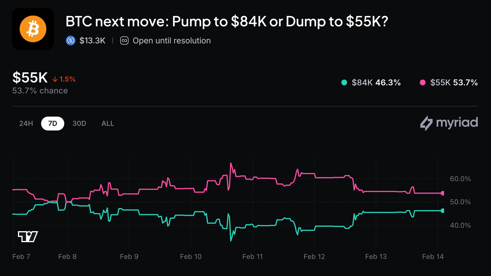 On Myriad, a binary market asks: “Will Bitcoin hit $84,000 or $55,000 first?” Current odds give $55,000 a 54% edge, with $84,000 at 46%. Volume is light, like a whisper in a vast steppe, meaning probabilities could shift abruptly.