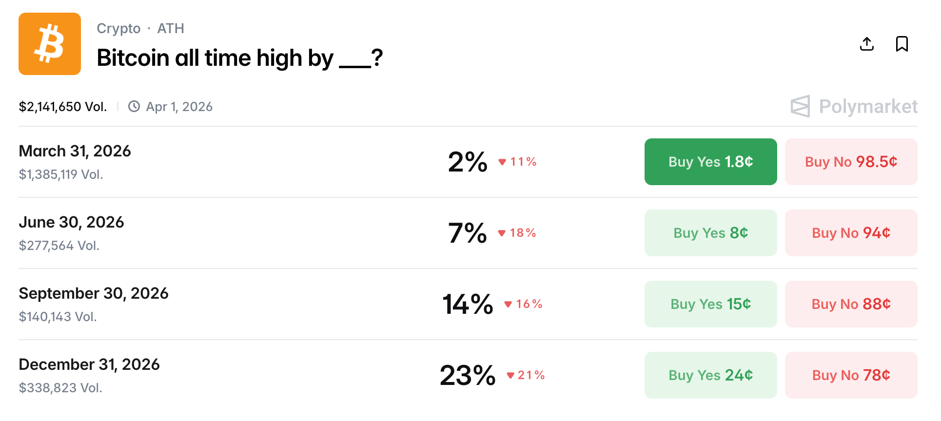 A timeline contract asks: “Will Bitcoin set a new all-time high by various deadlines in 2026?” Odds are low in the near term-2% by March, 7% by June. By Dec. 31, they rise to 23%. A steady climb, like a bureaucrat ascending the ranks of the civil service.