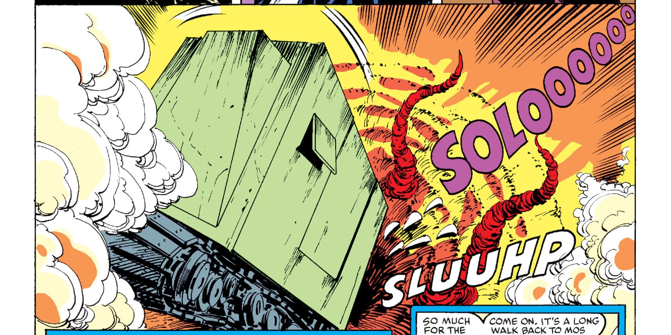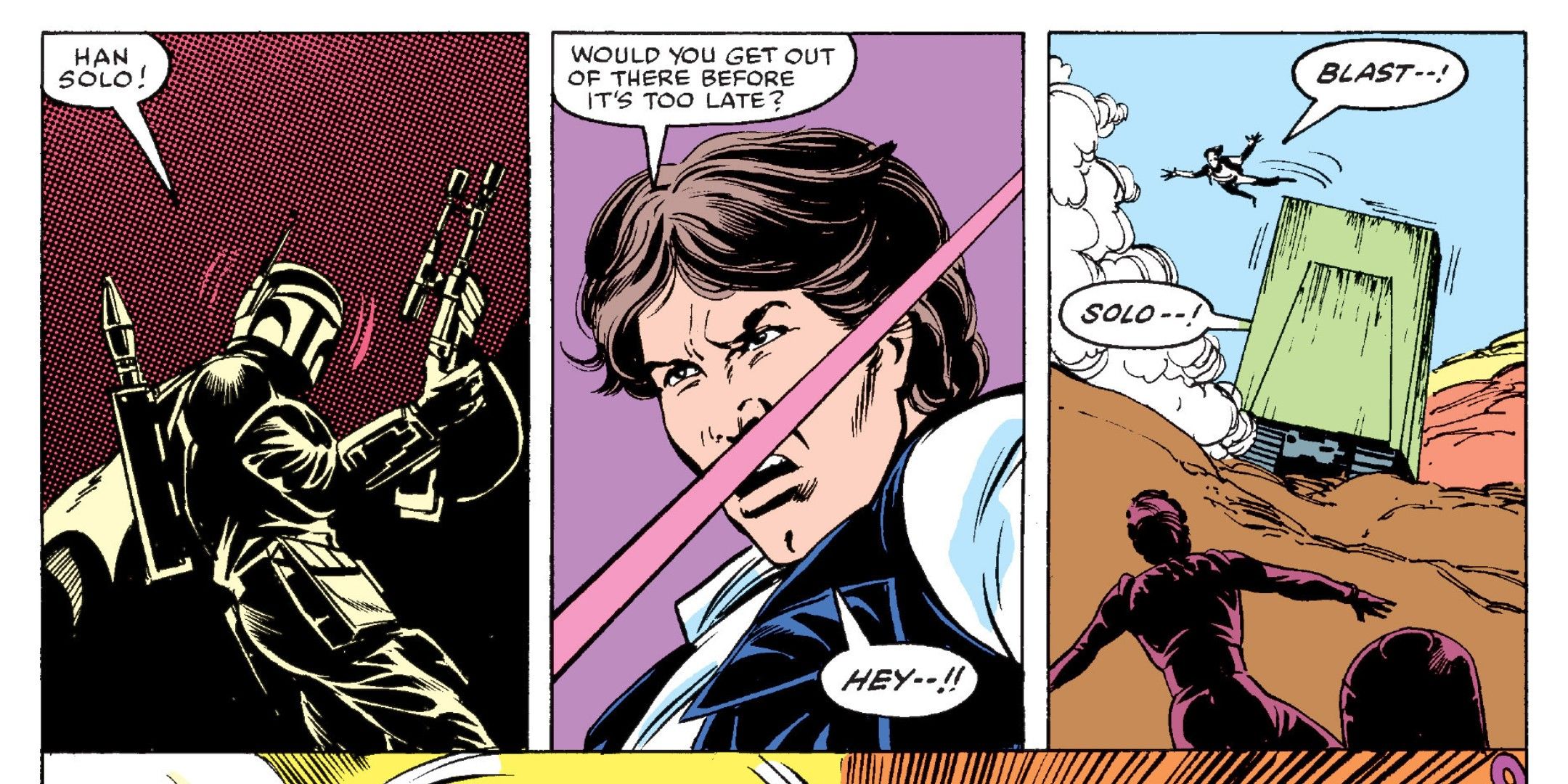 In the 1977 film Star Wars: Episode IV – A New Hope (issue #81), Boba Fett made his initial escape, coming out just a few months following Return of the Jedi. His stay in the pit resulted in memory loss, causing him to be mistaken for a robot and transported aboard a Jawa Sandcrawler. Later, Han Solo arrived on a separate mission with the intent of rescuing Boba Fett. However, their encounter occurred just before the Sandcrawler crashed into the sarlacc pit, leading Boba Fett to recall Han Solo and attempt to eliminate him once more, effectively dooming himself yet again.
