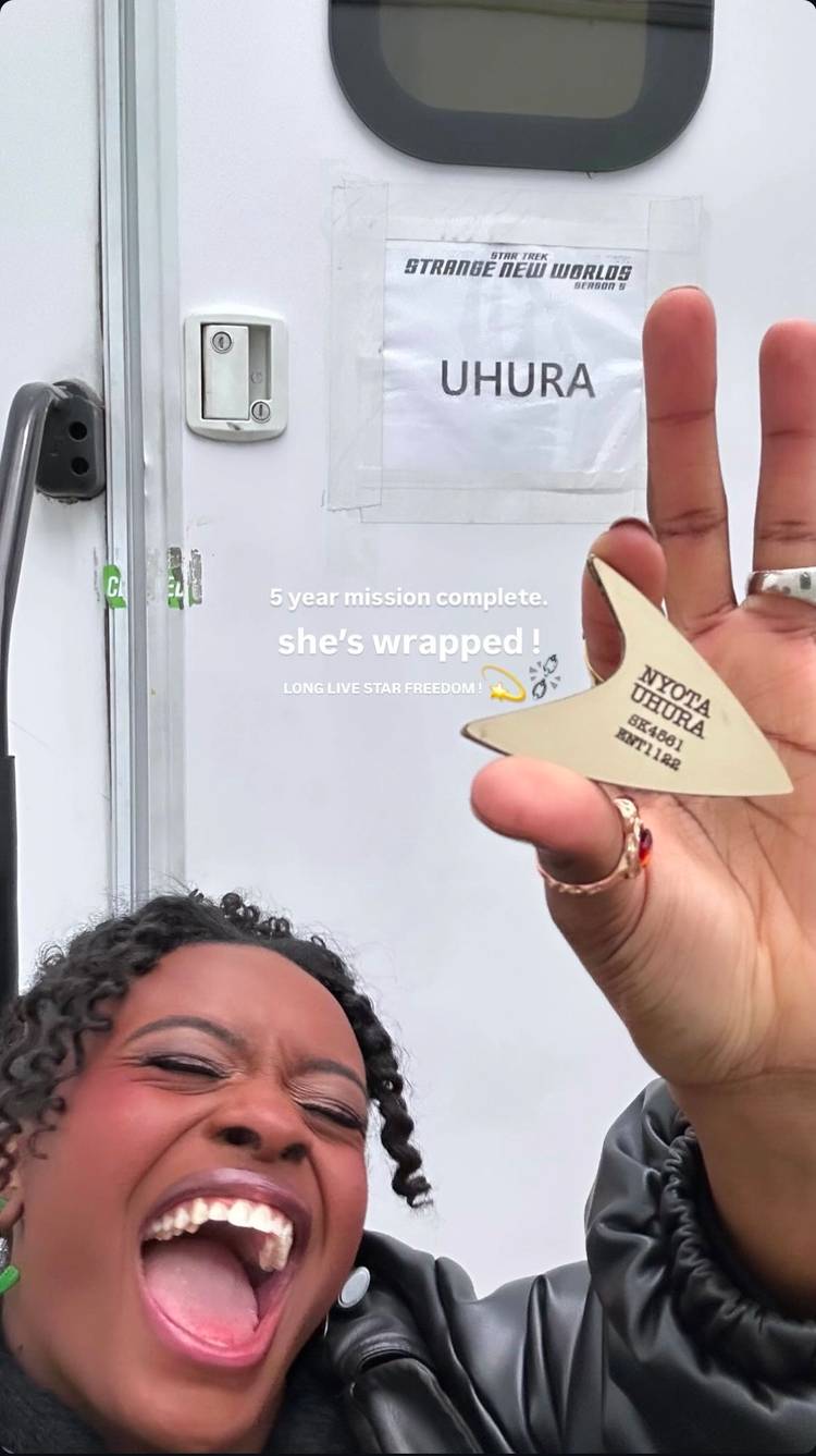 Celia Rose Gooding announced on Instagram that she’s finished filming her scenes on Star Trek: Strange New Worlds. She shared a photo of herself singing “Keep Us Connected” – a song from Star Trek‘s first musical episode – and posing with her character Ensign Uhura’s Starfleet badge, marking the end of her time on the show. You can see her post below!