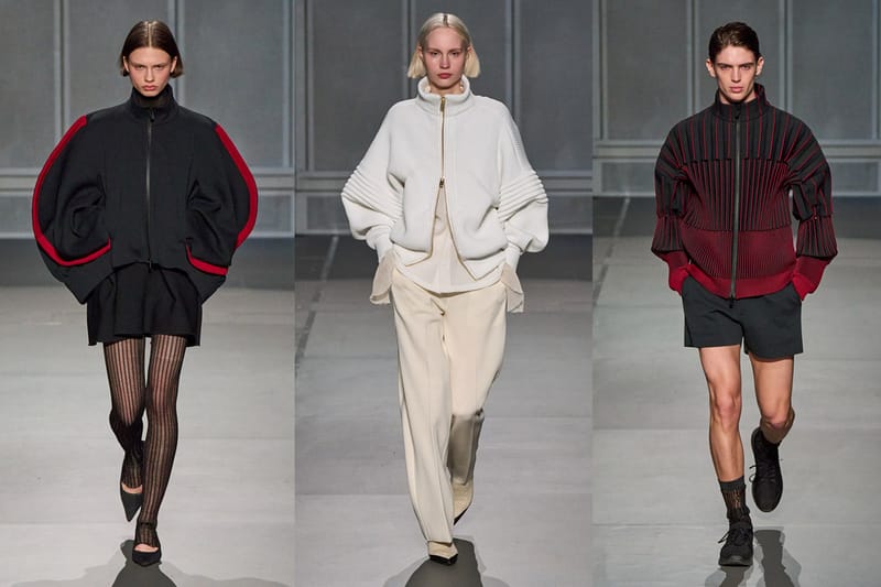 Consequently, every glance seemed to exude a sense of equilibrium. The predominant hues stemmed from black knits crafted from recycled polyester, with vibrant threads of primary shades such as red and blue interlaced, occasionally deviating towards softer tones like olive-green and off-white.