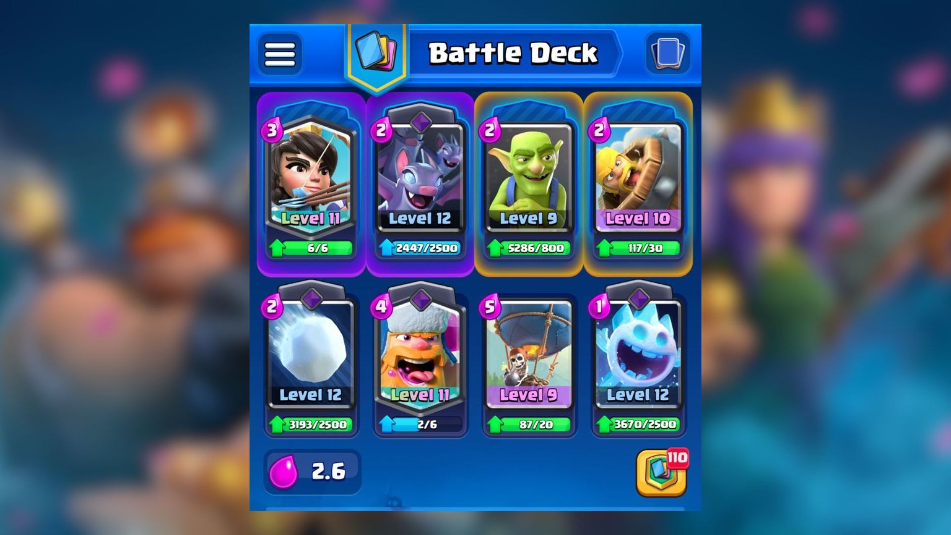 This deck focuses on a powerful combination: the Lumberjack and Balloon. It also includes low-cost cards like the Princess, Goblins, and Bats, allowing you to play your cards quickly and consistently.