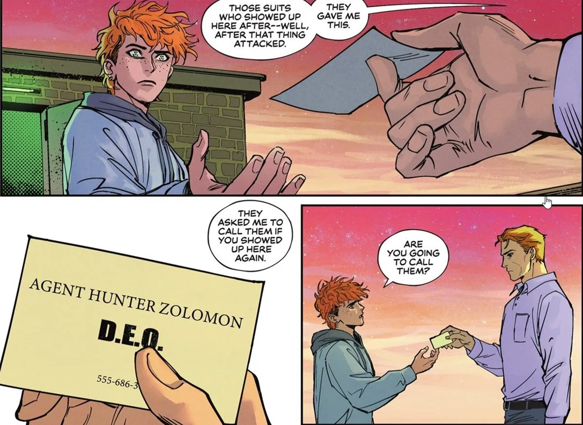 To prove how much he trusts Wally, Ralph shows him a business card from a government agent he was asked to contact if Wally ever returned. The card identifies Hunter Zolomon from the DEO. Ralph then destroys the card, reassuring Wally that he’ll always be welcome at the mission.