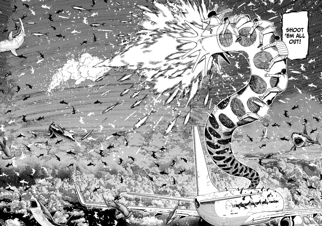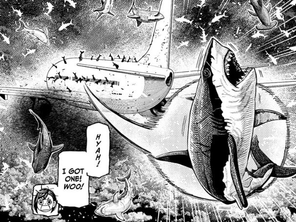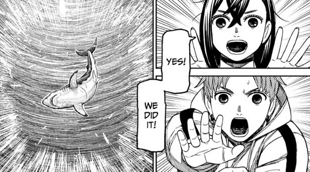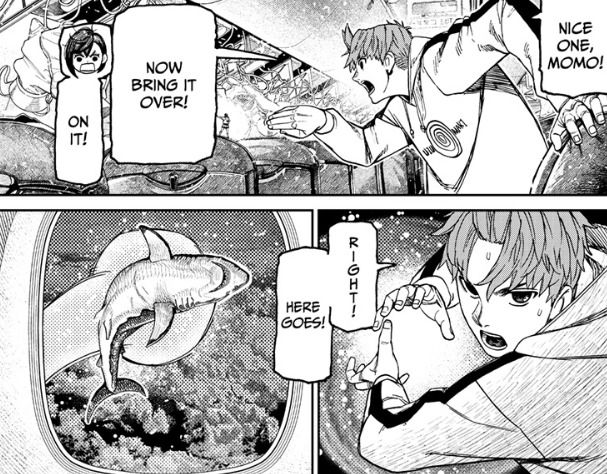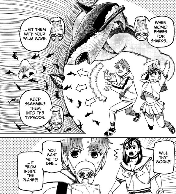 In “Dandadan” chapter 196, the charming duo of Momo and Jiji are made to seem as amusing as possible through a mix of playful humor and the manga’s most endearing chibi character designs. Their fishing adventure initiates with Momo using her massive spirit hand like a fishing line to catch the nearest unsuspecting shark, pulling it within Jiji’s vicinity where the fun and laughter reach their zenith. Jiji is tasked with accurately firing a chi strike through the aircraft’s wall without causing any damage, which he does to send sharks into the storm one by one. The first blast sends a shark shooting like a laser straight into the storm, but unfortunately, it has no effect on the storm whatsoever, making the situation even funnier thanks to Momo and Jiji’s goofy reactions.