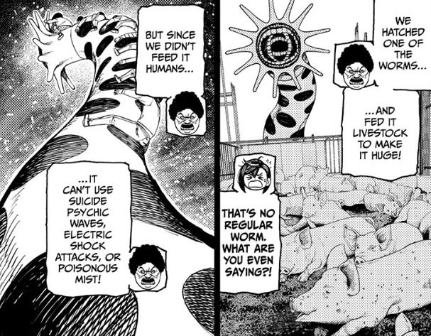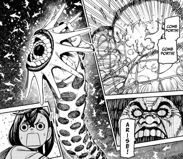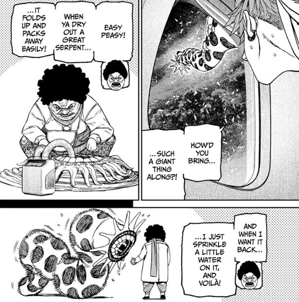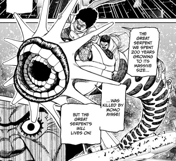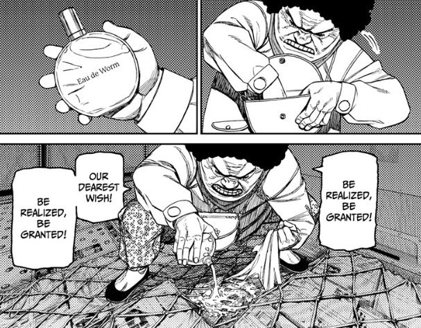 In issue 196 of Dandadan, Naki Kito symbolically completes the Evil Eye Arc by introducing the descendants of the Mongolian Death Worm, not a literal resurrection but a new creation born from the offspring discovered by the Kito family. The humor arises as Naki Kito explains her stealthy travel with such a colossal creature, and later, she utilizes her famous “Jennifer Lopez Anaconda” method to create room, followed by spritzing the “Eau de Worm” perfume to awaken the progeny of the original Mongolian Death Worm. A scene showcasing her innovative vacuum-pack technique further cements Naki Kito’s position as a comedic queen.