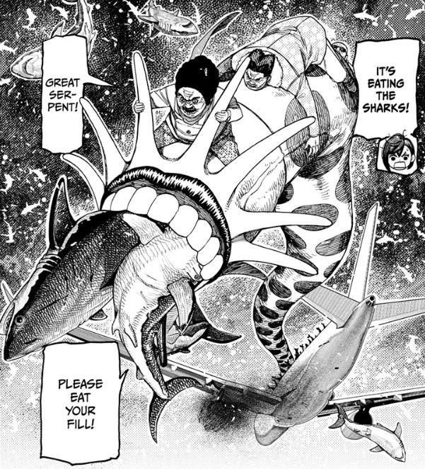 In chapter 196 of Dandadan, Granny Seiko Ayase asks Momo and Jiji to utilize their psychic talents to combat the Typhoon Human while they’re safely aboard an airplane. Miniature Momo’s special abilities will be active until they reach Shimane, a place known for the God of Izumo’s temple. Despite being in miniature form, Momo’s powers remain as potent as ever. This chapter showcases Jiji’s growth by having Granny Seiko praise his progress in mastering chi abilities, which she began teaching him to combat the Evil Eye yokai. Momo and Jiji then embark on a mission to catch sharks from the sky to use against the Typhoon Human, promising an exciting and unforgettable experience for their “date.” There’s no shortage of fish in the sea for them to work with!