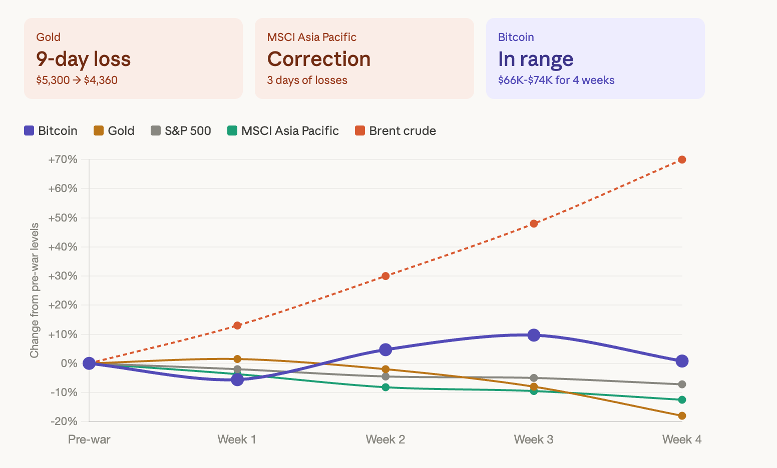 The weekly figures are not pretty. Gold, the asset that should shine brightest in times of geopolitical chaos, has taken an 18% nosedive from its recent highs. Asian equities are facing a correction. Bitcoin may be down 6% for the week, but it still holds above the $66,000 floor that has withstood every war-driven sell-off since February 28.