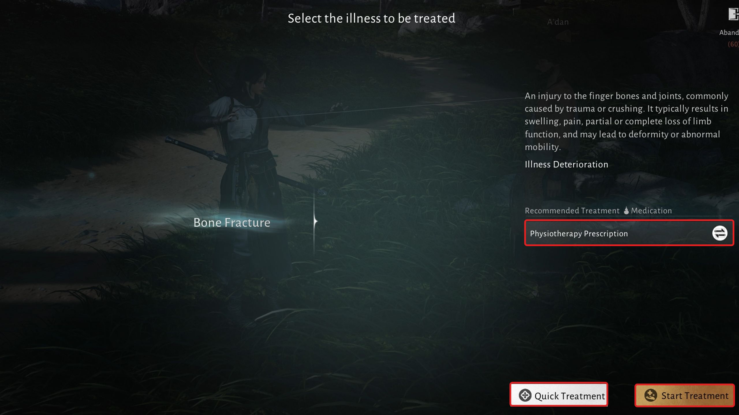 After diagnosing the illness, you’ll need to select a treatment method. You can choose between Physiotherapy and Qi Therapy, and the game will recommend the most effective option. If your Mastery level is high enough, you can use Quick Treatment to automatically succeed, bypassing the treatment mini-game. Otherwise, you’ll need to begin the treatment and carefully use the correct prescription.