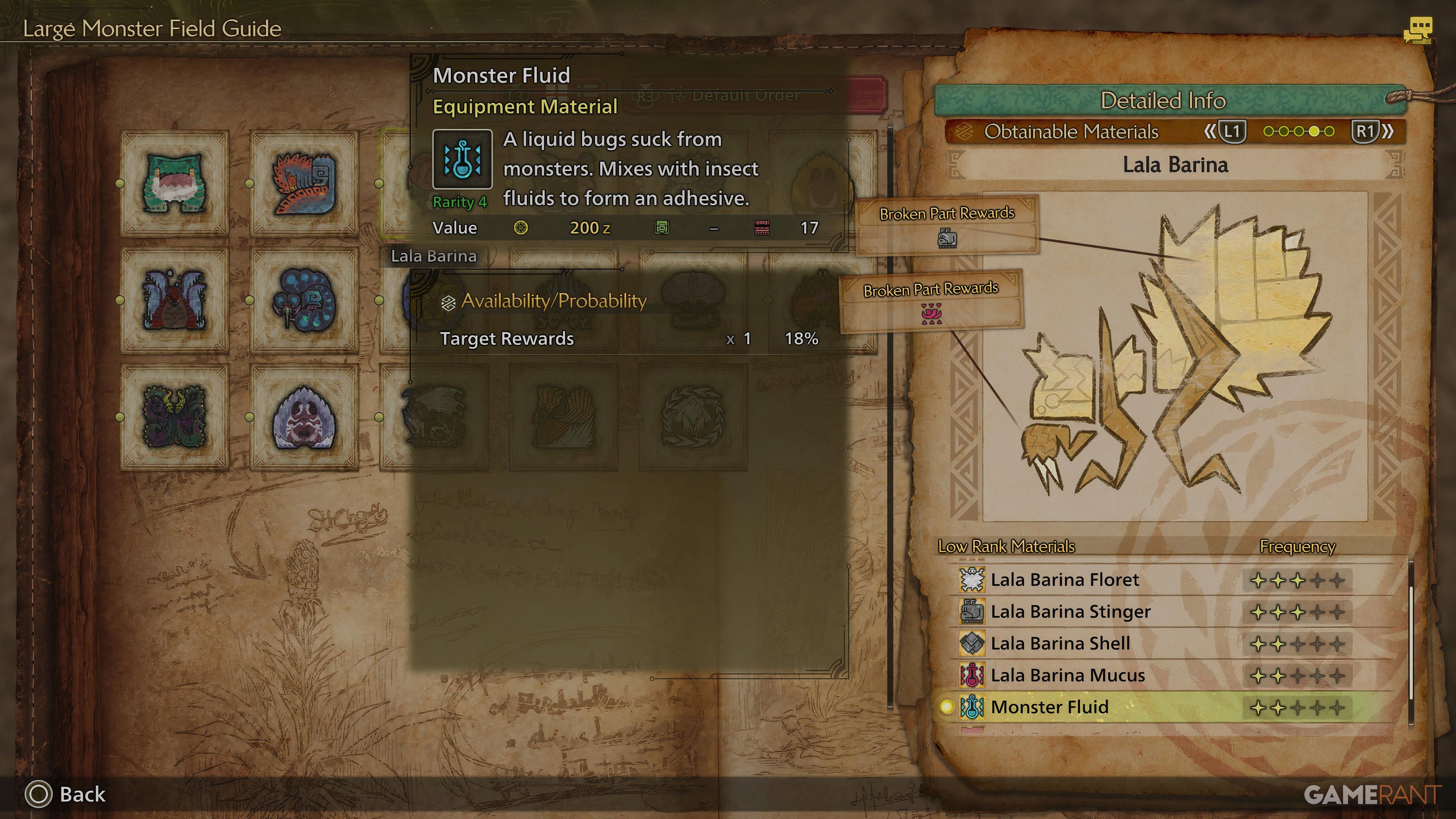 Five monsters yield the valuable resource known as Monster Fluid. To start with, players should hunt down a monster called Lala Barina, who makes her debut in the main quest titled “A Stage of Rose and Thorn.” Lala Barina can be tracked down in either the Scarlet Forest or the Ruins of Wyveria, with the latter becoming accessible at a later point during the narrative. Important to note, only 18% chance of Monster Fluid dropping from this Large Monster. Among the smaller monsters, there are multiple viable targets for players to pursue.