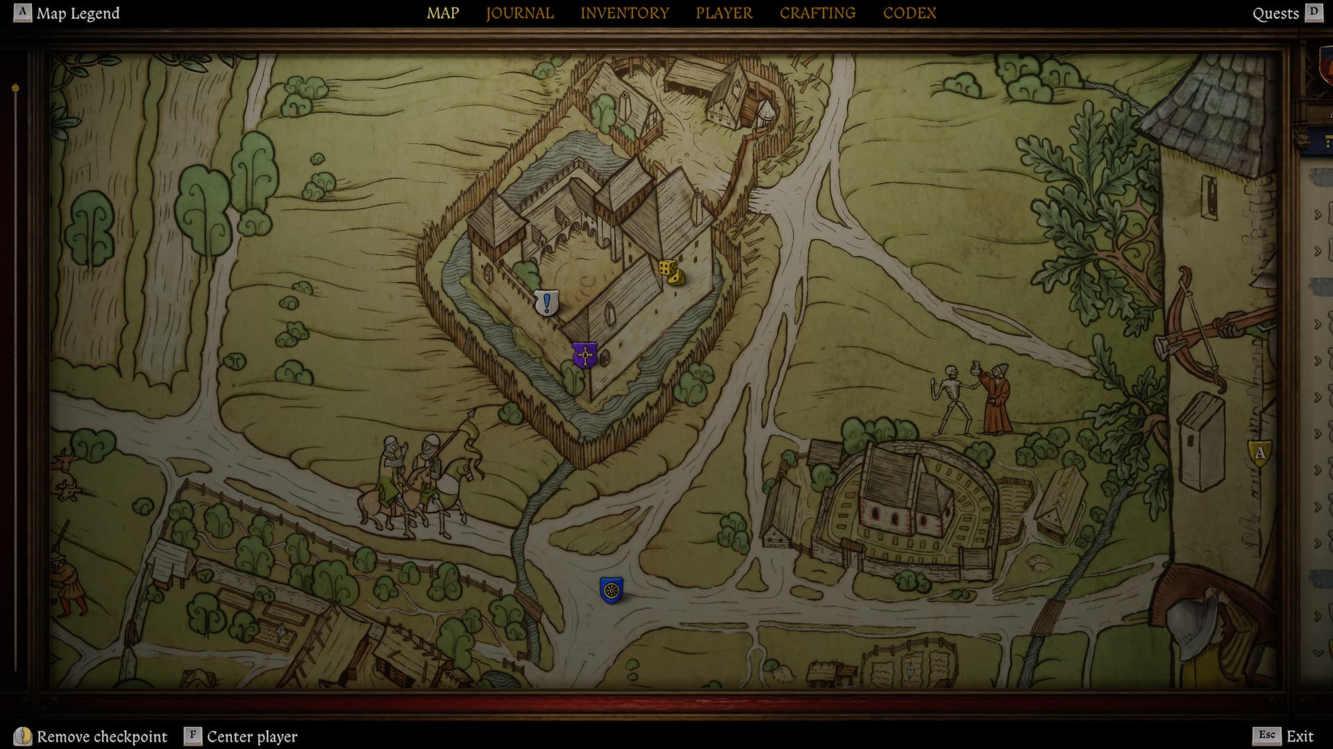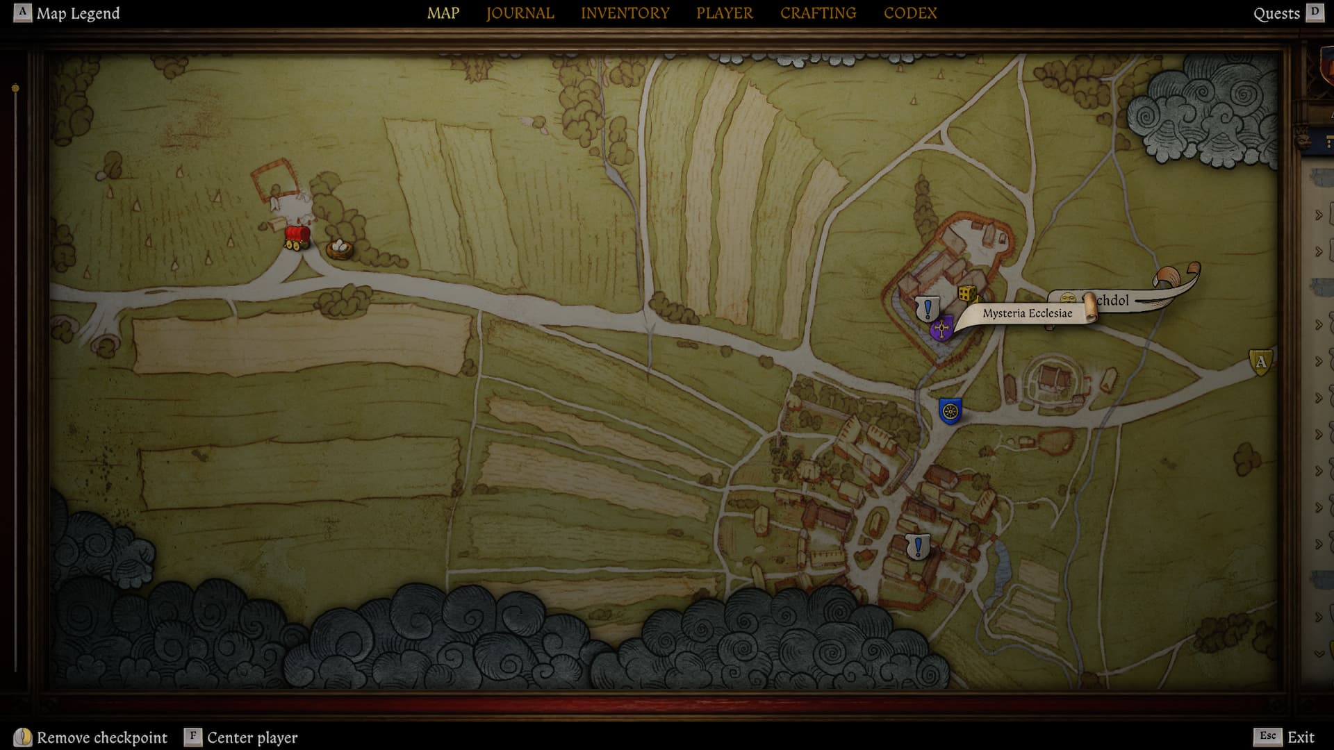 To begin the Mysteria Ecclesiae DLC, you first need to reach the Kuttenberg map and progress to at least day two of “The Sword and the Quill” quest – this is the main quest that starts when you arrive in Kuttenberg. Make sure you’ve spoken with Peter and slept for one night. Then, open the map for the Suchdol area; you’ll find a new icon – a golden cross on a purple background – indicating the DLC’s starting point.
