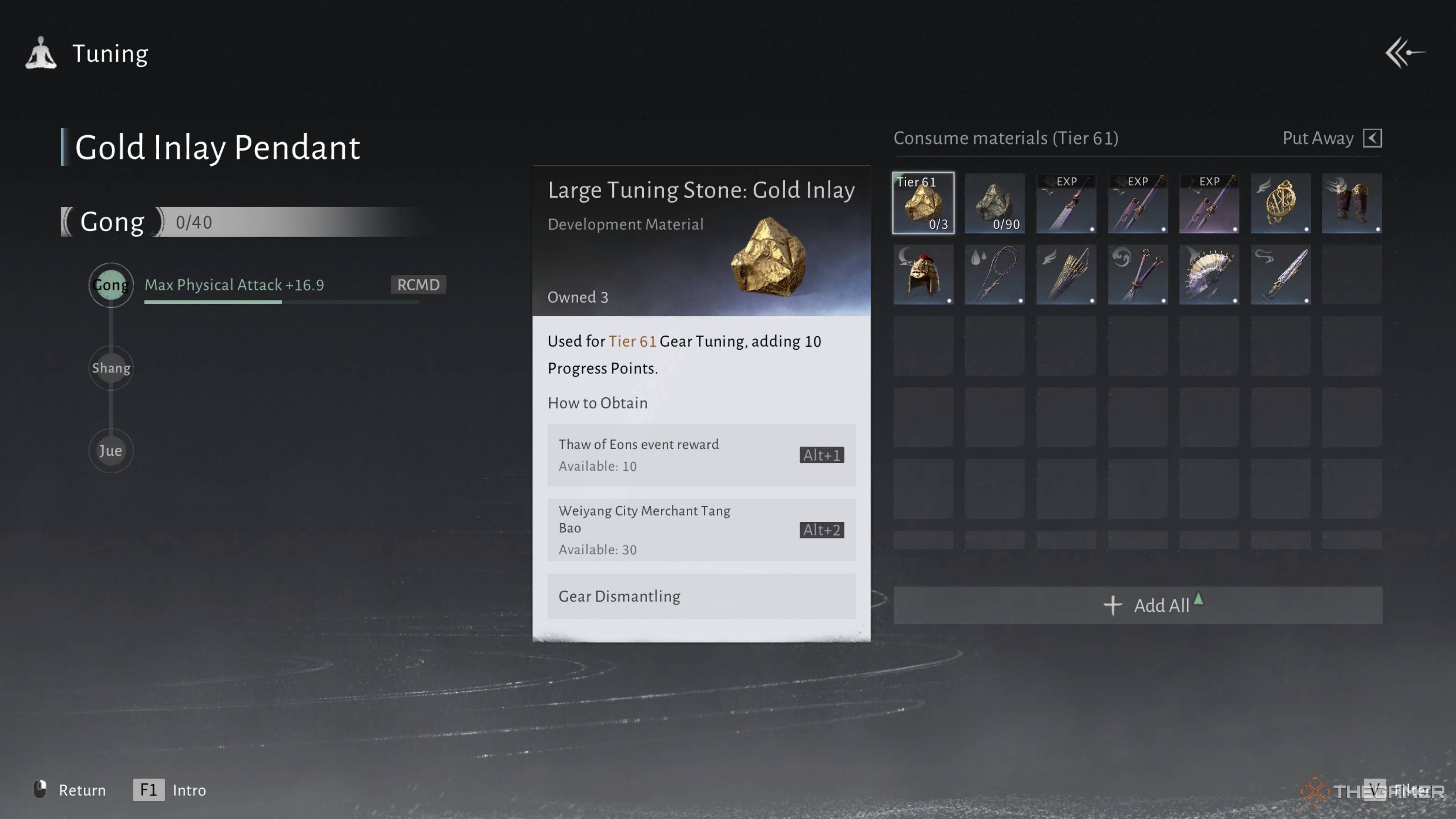 Tuning is the first step in upgrading your gear, and it’s used on items that are blue or lower in rarity. Epic (purple) gear doesn’t need this initial tuning process.