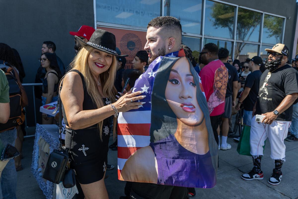 Torres was near the front of the line, having joined it around 10:30 a.m. Standing next to him was Arlene Heaton, who had driven three hours from Rosamond to be there. They met while waiting and quickly became friends – Arlene wore a sparkly outfit, and Torres had a flag with Cardi B on it draped over his shoulders.