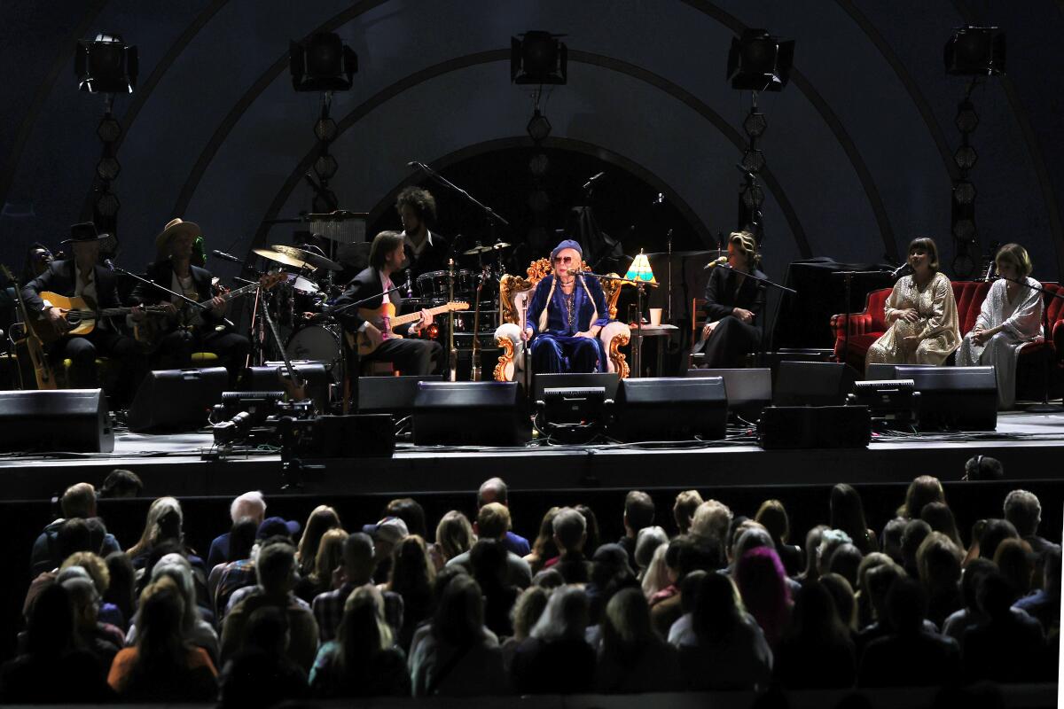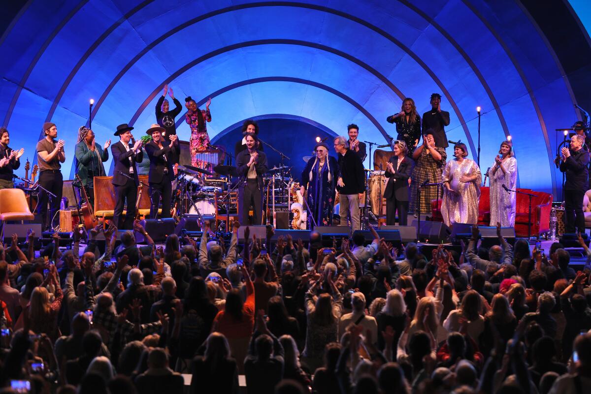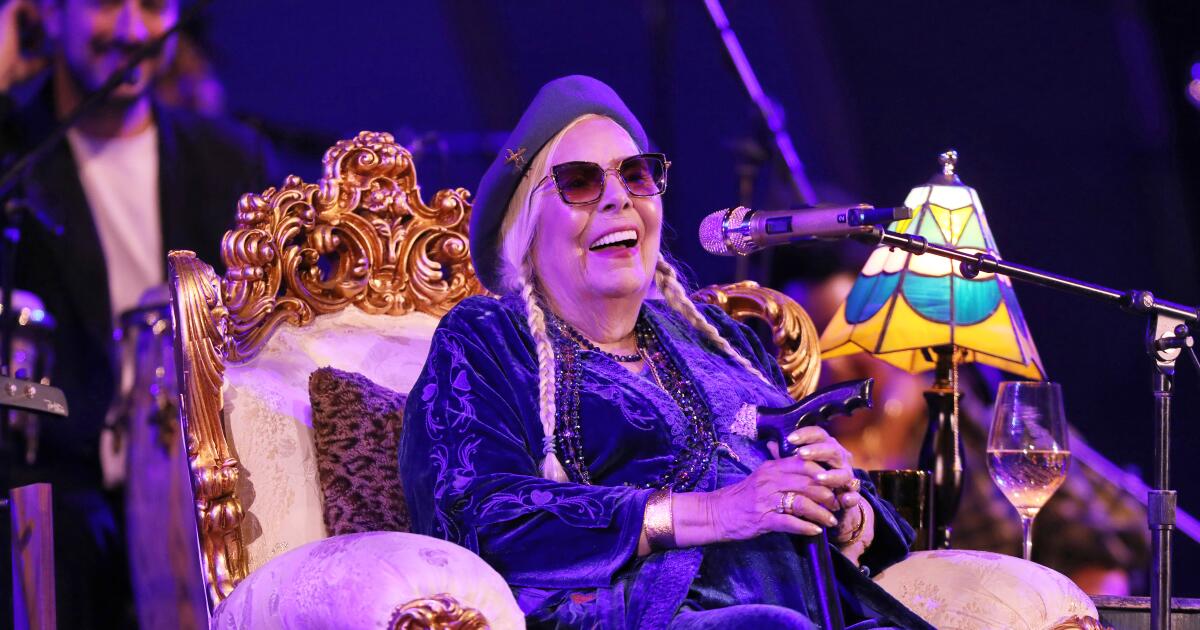 80-year-old Joni Mitchell, seated on a golden armchair and positioned near the center of a rotating stage, gracefully came into sight at the Hollywood Bowl on Saturday night, as if she had just overheard a witty remark at a gathering. She chuckled once more, taking in the 17,000 fans eagerly awaiting her first headlining show in her adopted hometown since her near-fatal aneurysm in 2015. Her laughter echoed again as the dozen musicians nearby began the opening act of what would become a three-hour performance.