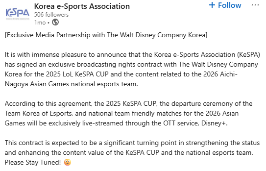 Okay, so huge news for us esports fans! Back in October 2025, KeSPA announced they’re partnering with Disney Korea. What that means is Disney+ is now the only place you’ll be able to watch the KeSPA Cup 2025. But it doesn’t stop there – they’ve also got the exclusive rights to live-stream all the esports action from the 2026 Asian Games in Aichi-Nagoya, right on Disney+! Pretty big deal for the platform, and awesome for us because it means more content.