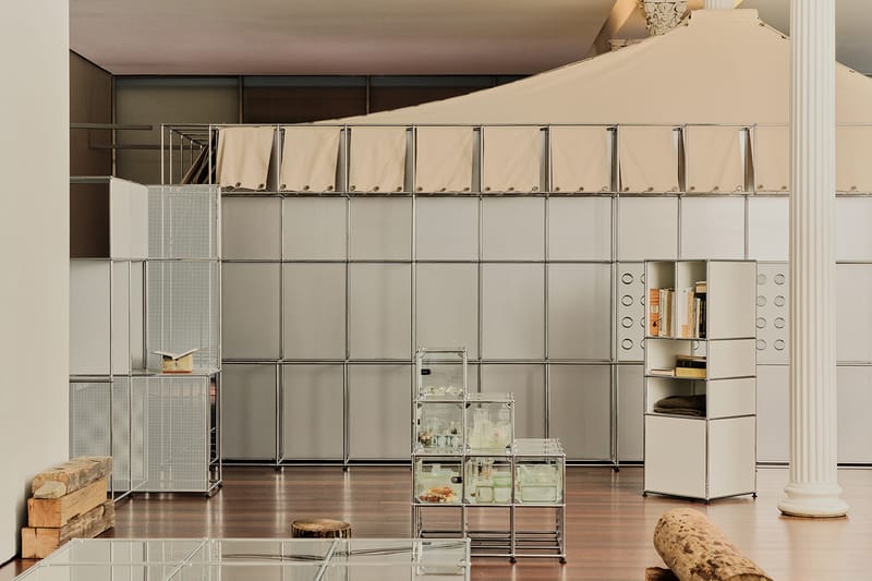 - It features repurposed USM modular systems into architectural tents, steel paravents and reclaimed Catskills timber accents