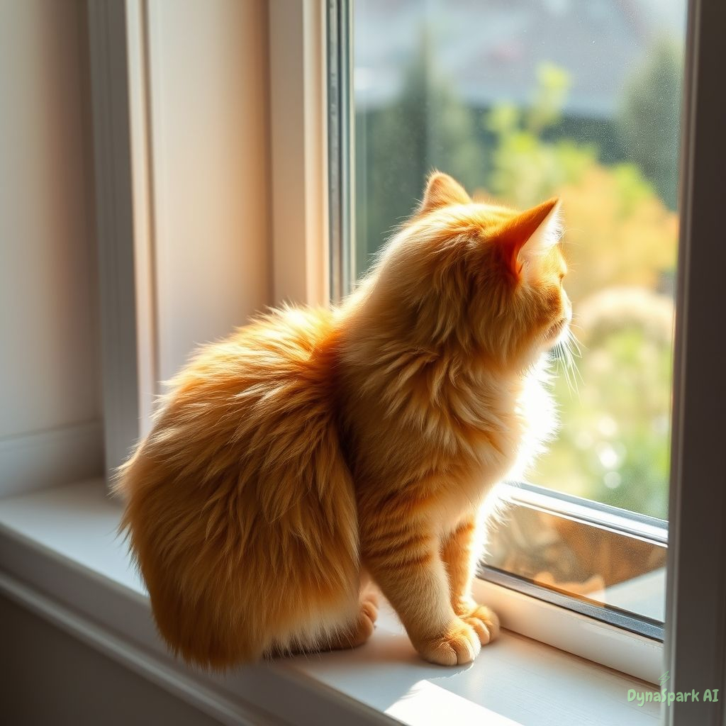 Enhanced Prompt: A fluffy orange tabby cat sitting on a windowsill, gazing out at a sunny garden, with realistic lighting and fur texture