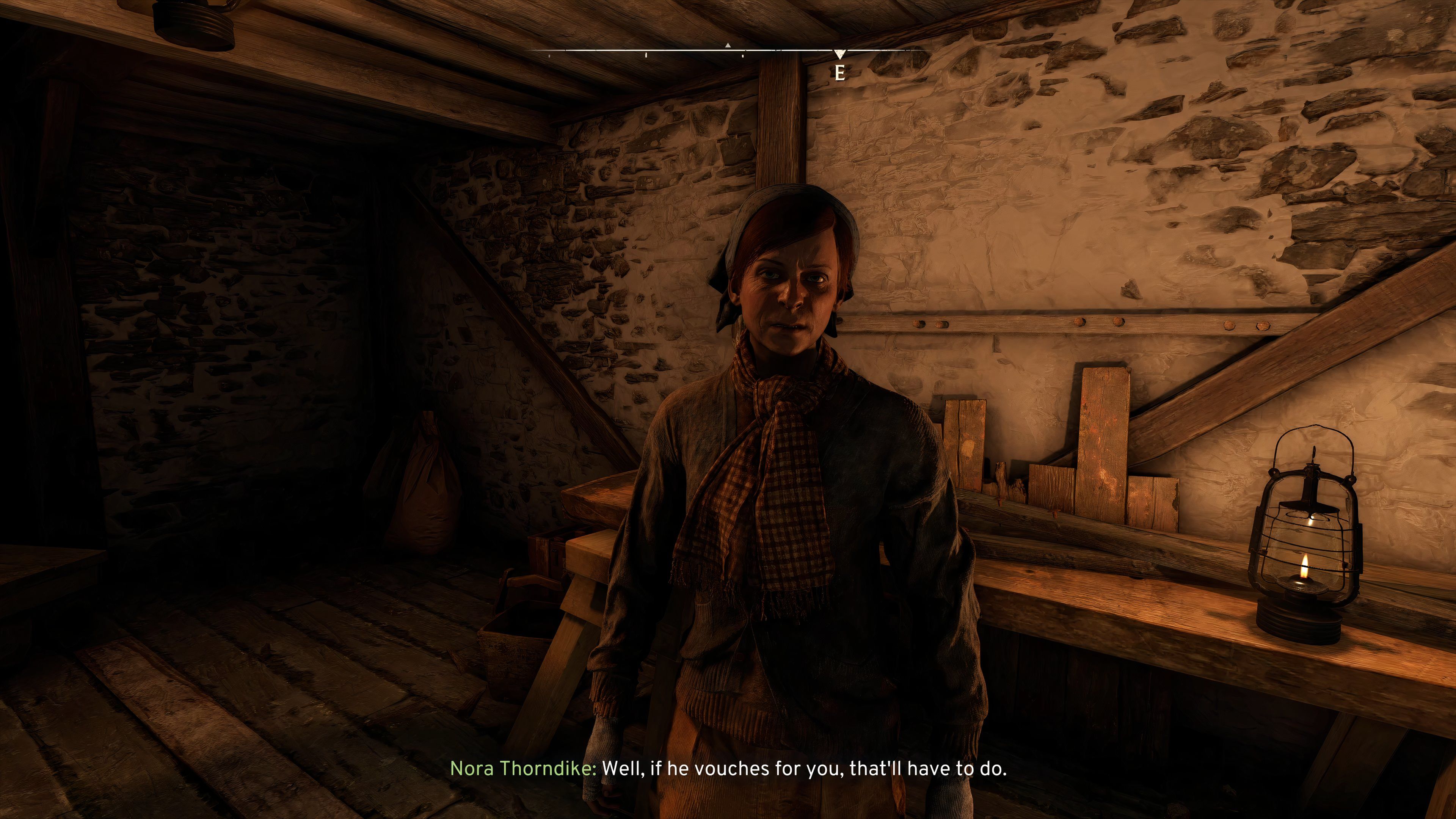 - Finally, there’s Nora Thorndike, who will be hiding in the cellar of her barn at the coordinates 41.8 E, 77.5 N. In addition to a bunch of healing items, she’ll also possess an Atomic Battery that she’ll be willing to part with.