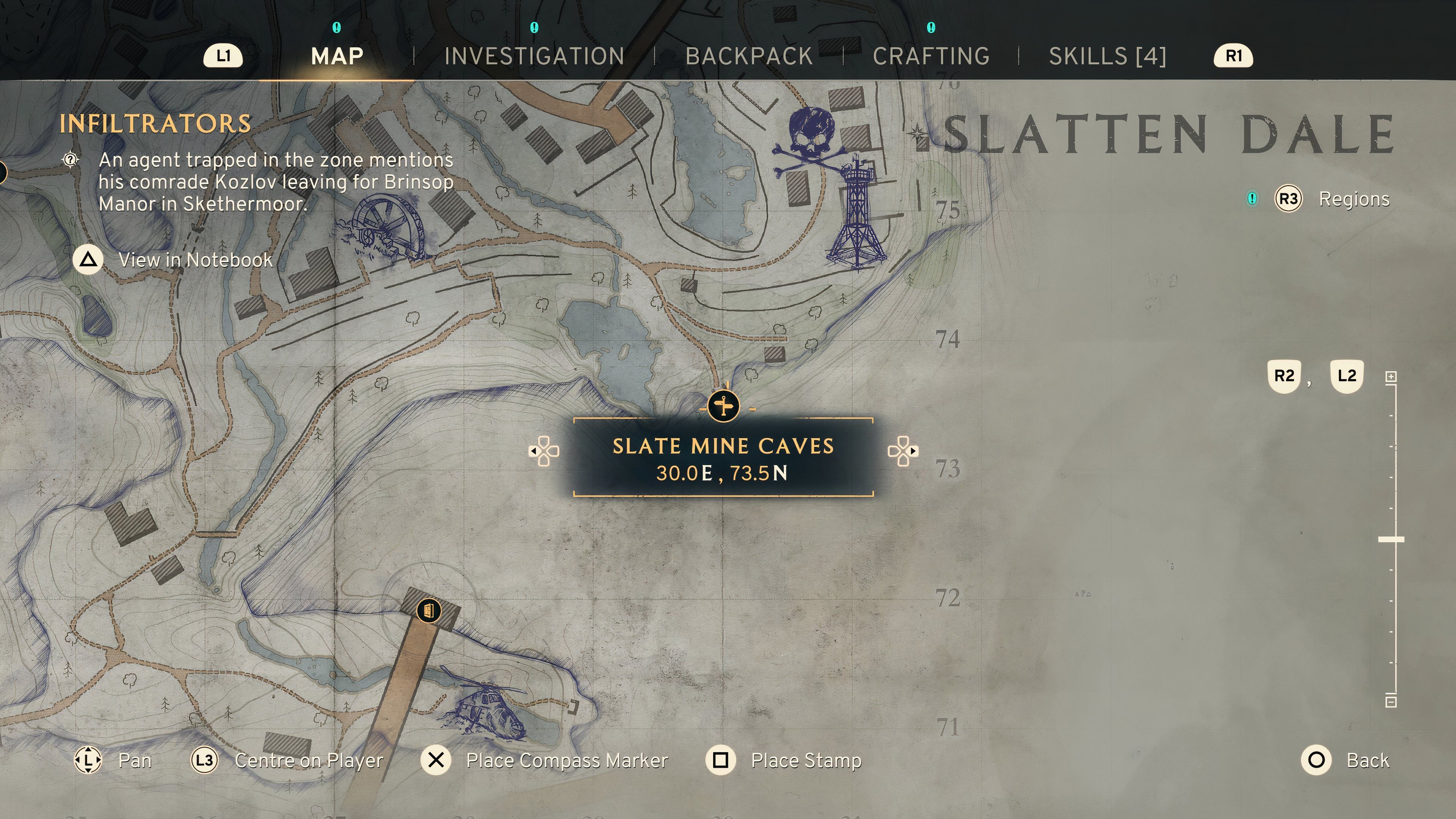 - In Slatten Dale, there’s an entrance that will take you into the Slate Mine Caves, located at 30.0 E, 73.5 N. Inside, you’ll find an old miner named Reg Stansfield, who will gladly trade his goods with you.