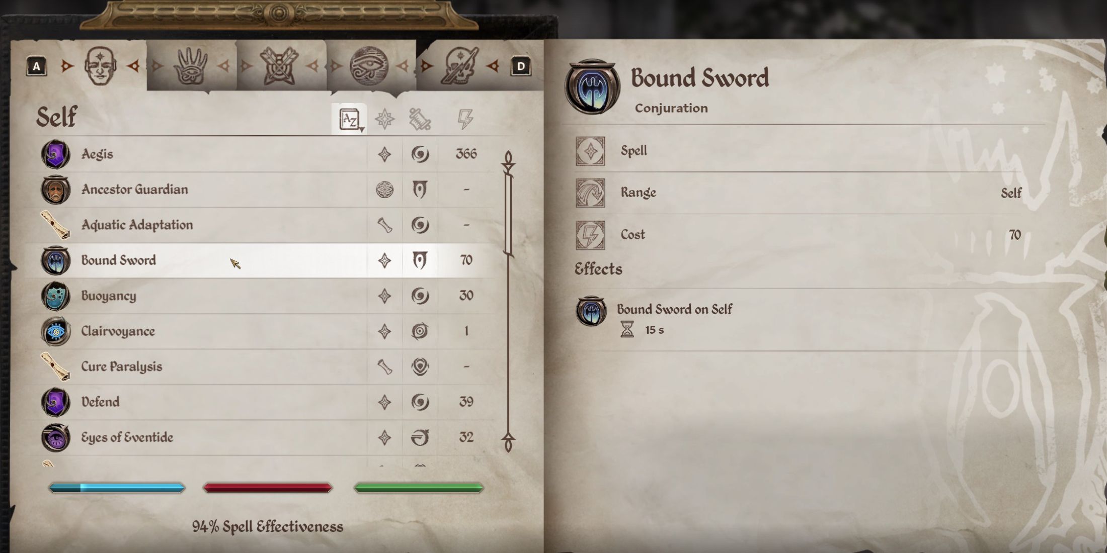 - Bound Sword: Conjures a two-handed Bound Sword to use for 15 seconds, one of the strongest weapons in Oblivion