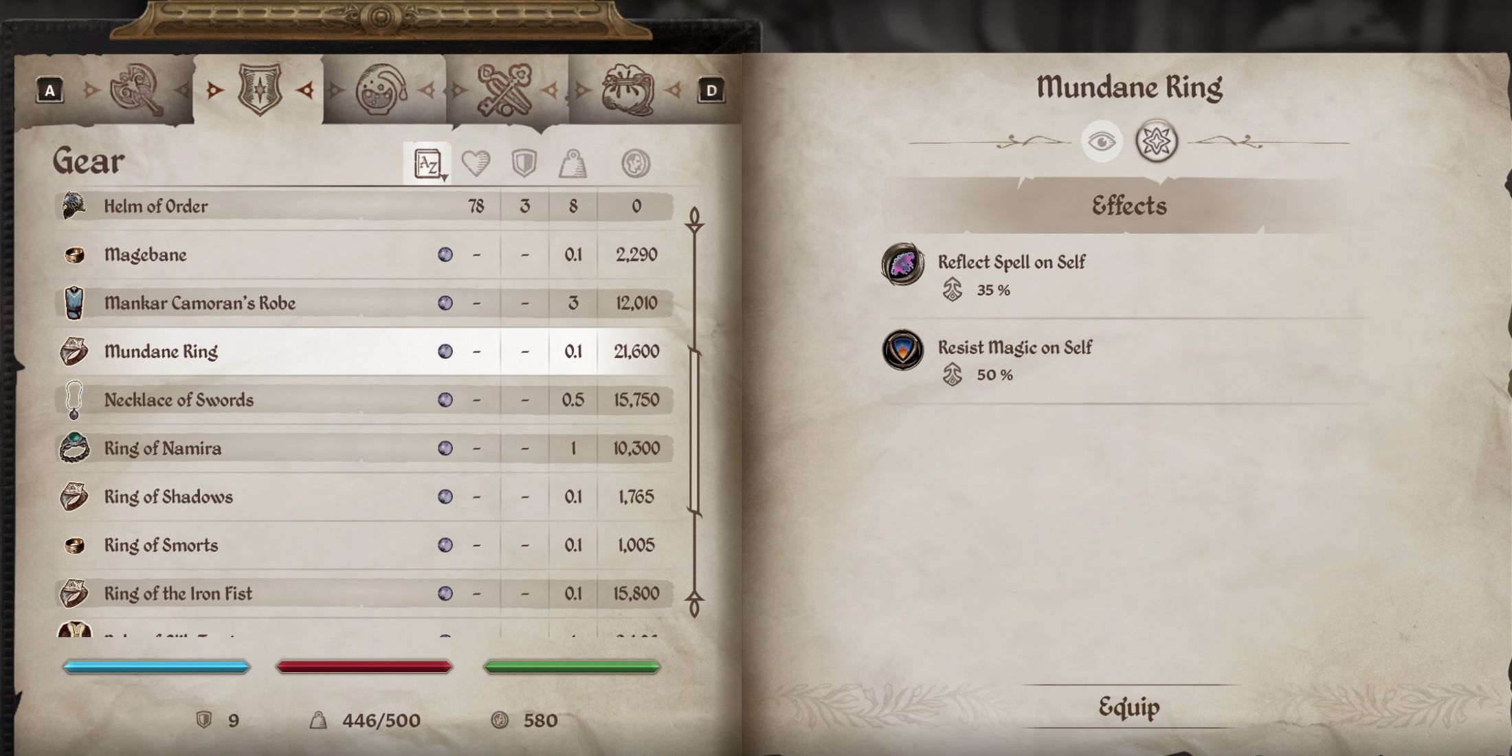 - Mundane Ring: Grants 35% Spell Reflect and 50% Magic Resist. Combined with Breton’s inherent 50% Magic Resist, this effectively makes you immune to Magic damage.