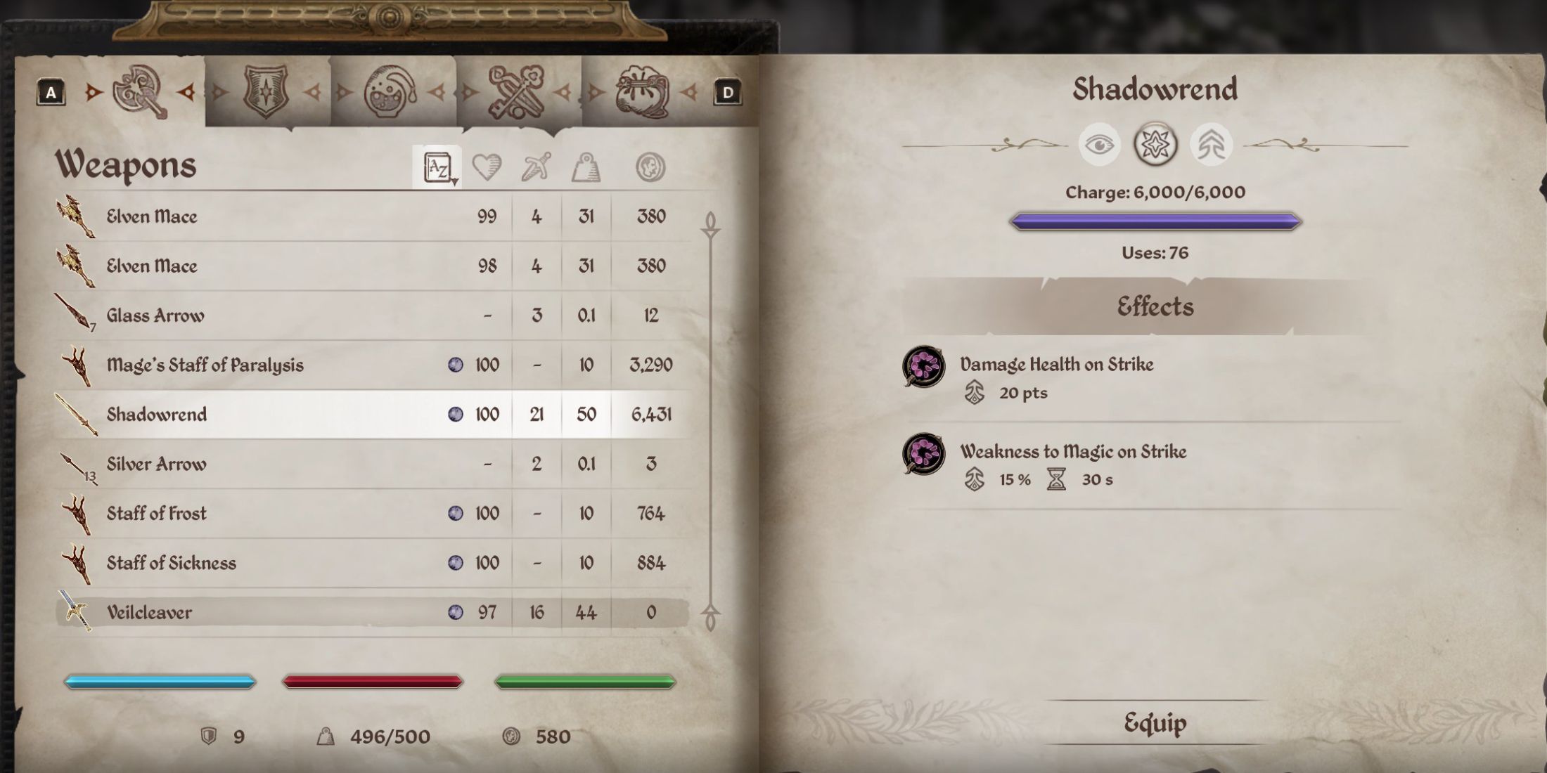 - Shadowrend (Blade): Scales in damage, starting at 12 damage if acquired at Level 1. Comes with the Damage Health and Weakness to Magic enchantments.