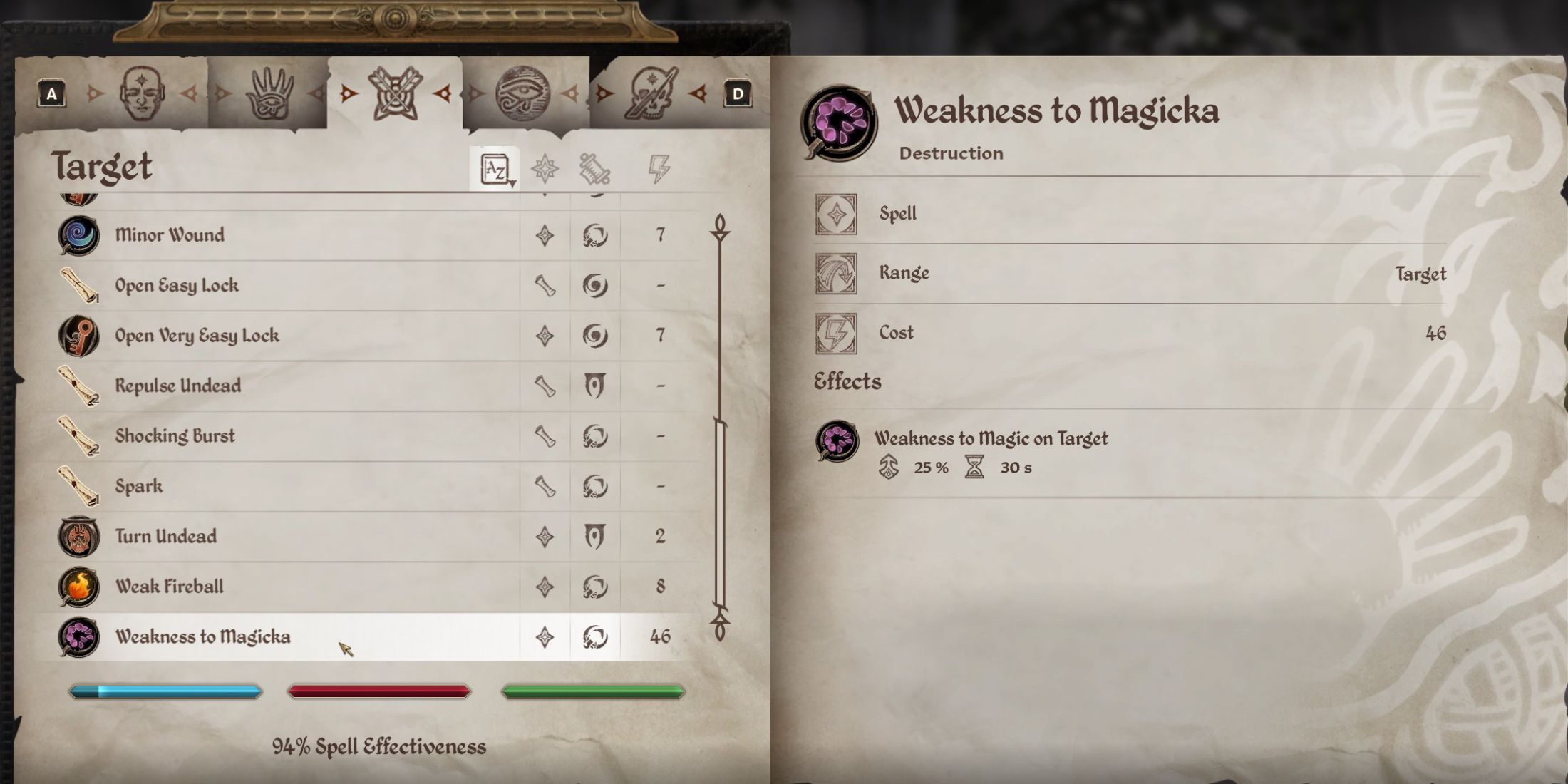 - Weakness to Magicka: Inflicts a 25% weakness to all Magic damage on touch that lasts for 20 seconds