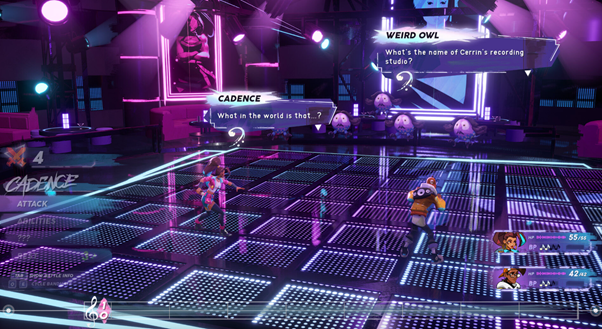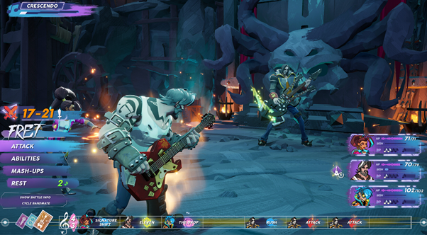 The combat in People of Note is disappointing. While it uses musical terms like ‘stanzas’ for turns and displays a time signature, the actual fighting feels completely unrelated to music. Every attack, no matter the character or ability, boils down to the same simple button-press when two circles align. A guitarist’s powerful move and a DJ’s special attack feel exactly the same to play.