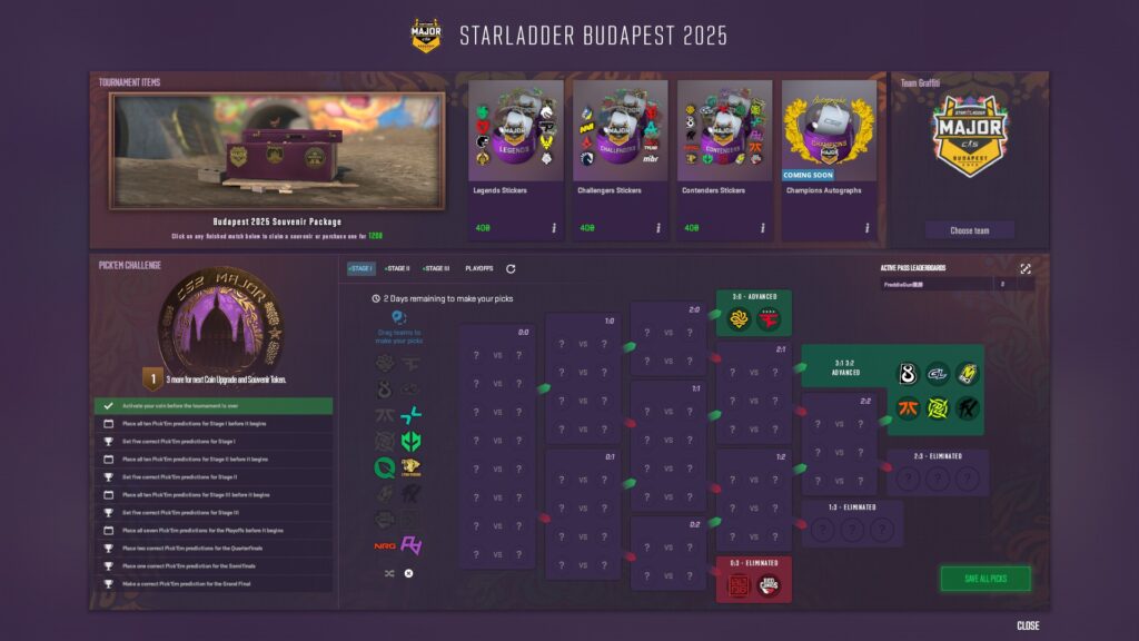 To participate in the Budapest Major Pick’Em challenges, you need to purchase the Viewer Pass within Counter-Strike 2. There are two different pass options available.