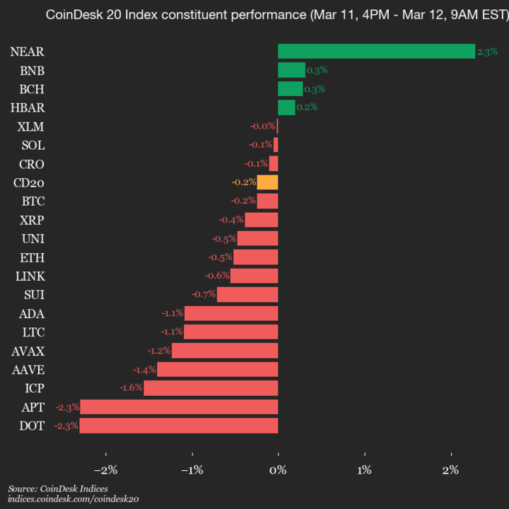 The CoinDesk 20, that paragon of stability, now teeters at 2012.94, having shed 0.2% like a miser parting with a penny. A mere 4.89 points lost since 4 p.m. ET-truly, a day of profound financial drama.