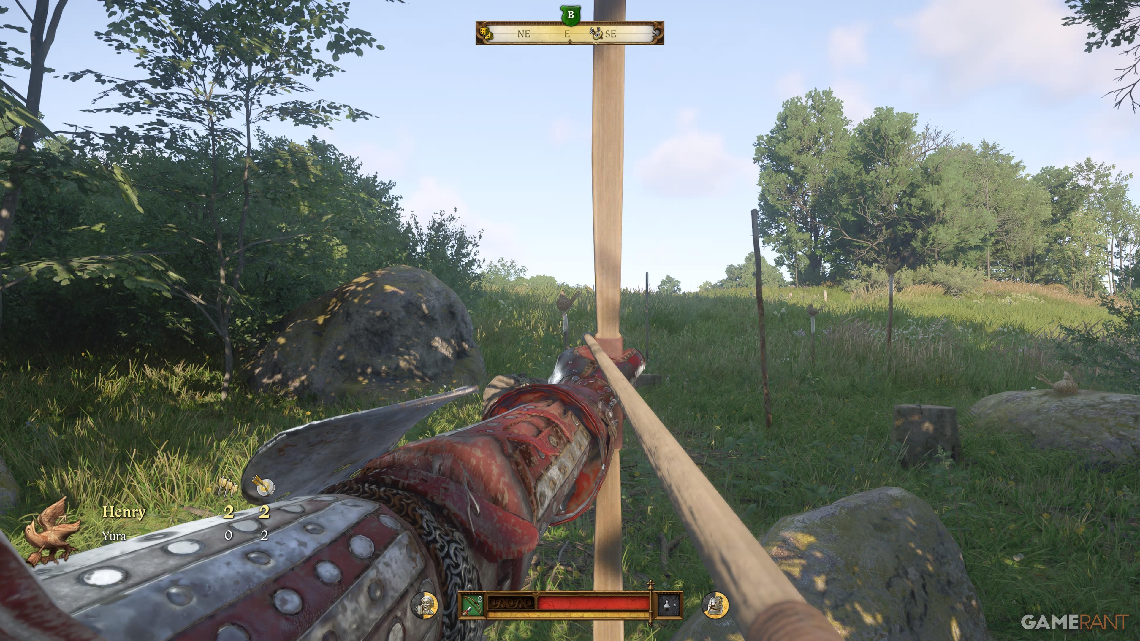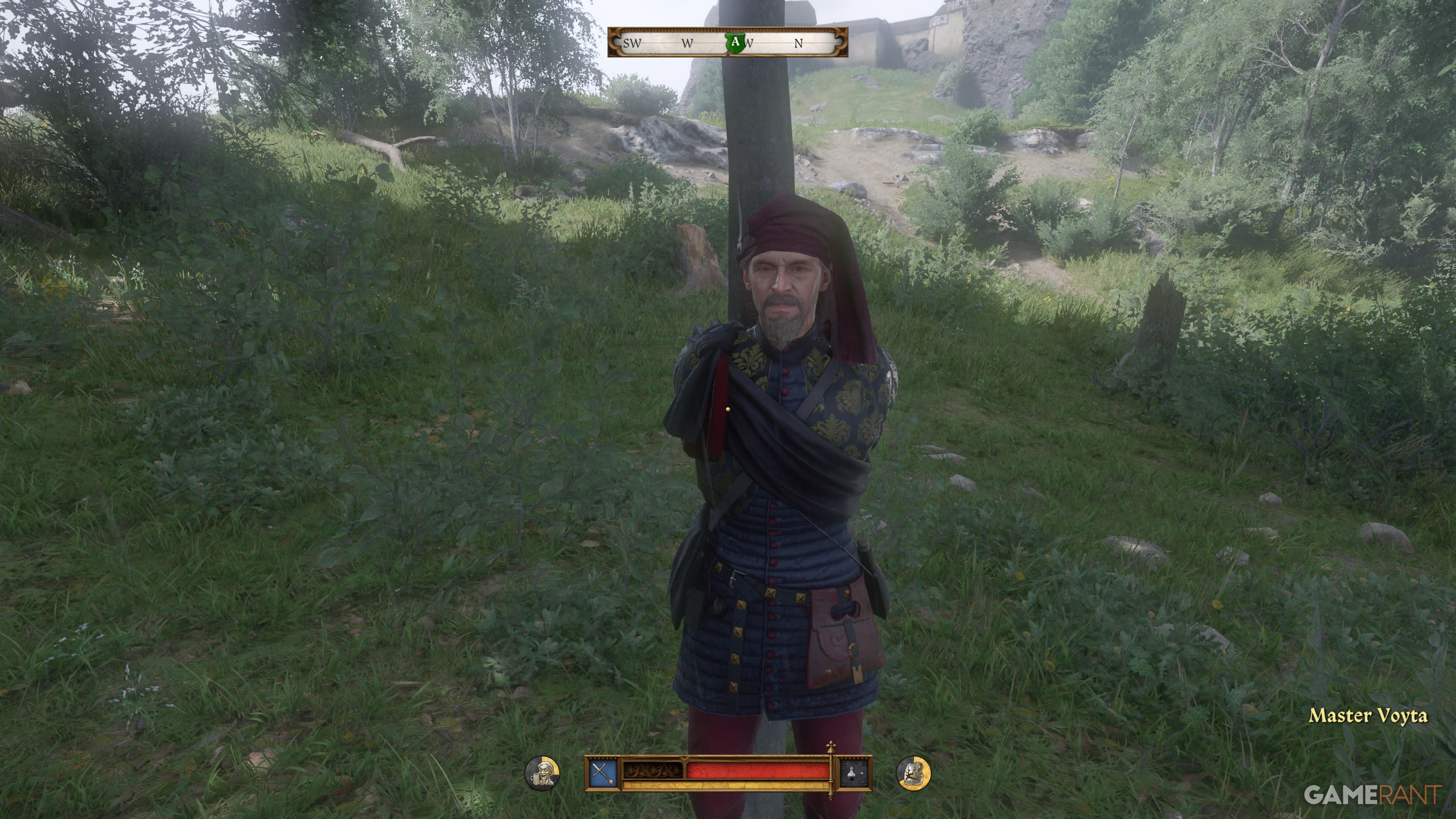 To embark on your journey, it’s essential that you finish the primary story quest known as “For Whom The Bell Tolls” first. After its completion, look towards the southeast of Trosky Castle on your map, where a purple marker signifies the location of the upcoming quest. From the castle, summon your horse and ride towards the marked spot. Upon your arrival, you’ll encounter a man tied to a tree, which triggers a cutscene featuring him conversing with a skull. As two wolves emerge, Henry will offer his assistance, and it’s up to you to handle them.