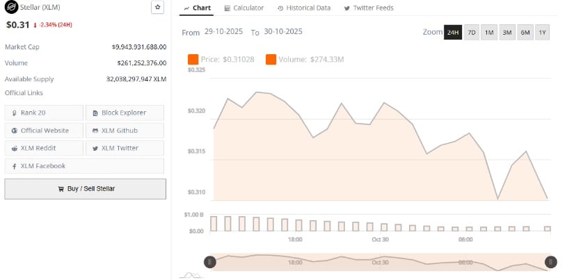 Meanwhile, BraveNewCoin tells us that Stellar is playing it cool at $0.31, a modest 3.09% increase over the past 24 hours. Its market cap is a whopping $9.94 billion, which sounds impressive until you remember it’s all relative. The coin’s liquidity is still up there with the top 20 cryptocurrencies, so it’s not exactly out of breath yet. What does that mean? Well, the trading volume’s above $261 million, which suggests people are still interested, but nobody’s screaming “to the moon!” just yet.