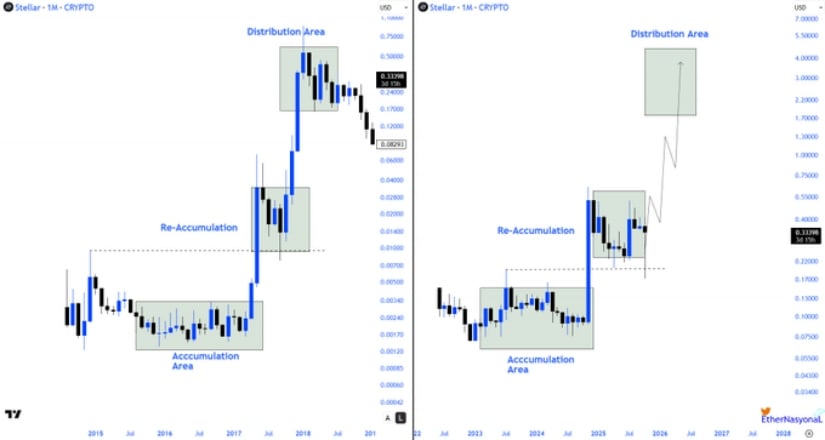Crypto GEMs, the oracle of digital fortune, has drawn some fascinating comparisons between Stellar’s past and present. Remember those Wyckoff-style phases that took XLM from an unassuming token to a parabolic surge in 2018? Well, history might be trying to rhyme again-this time between 2023 and 2026. So yes, the charts are showing the same pattern, but with more flair, more drama, and possibly more coffee involved.