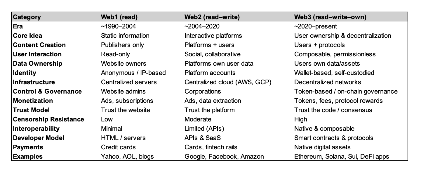 Web1: Information online | Web2: Platforms and social interaction | Web3: Ownership, composability, and programmable value