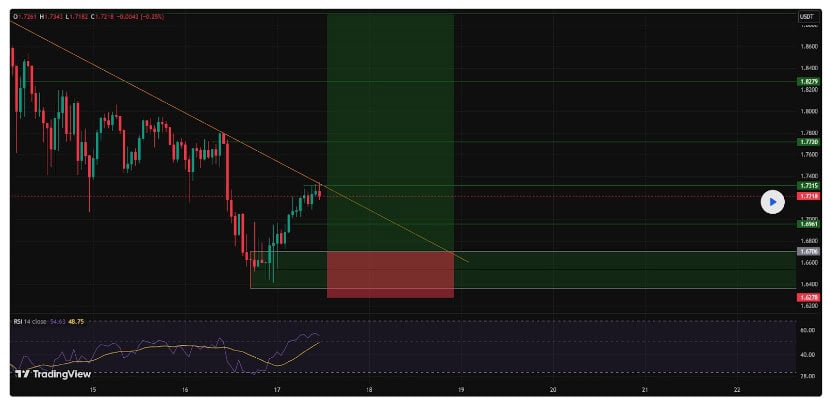 - Close above $1.69: “Maybe a rally to $1.77? But only if volume cooperates and Bitcoin doesn’t yawn.” 🤷♂️