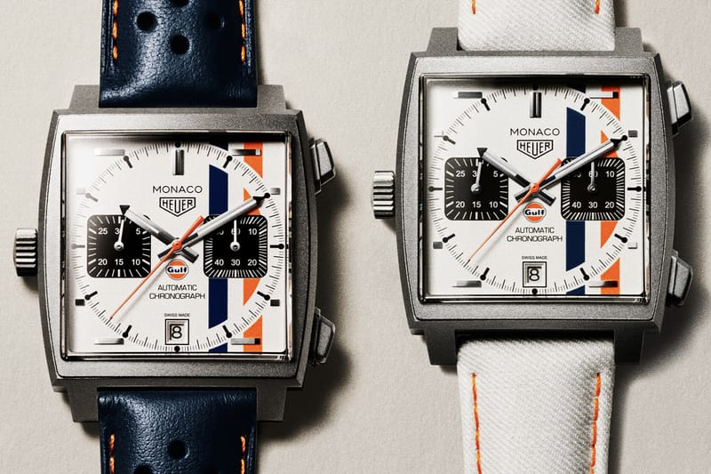 This unique collaboration showcases the iconic Gulf color scheme, distinguished by its light blue and vibrant orange hues, which gained prominence in endurance racing throughout the late ’60s and early ’70s. The straps on this model are handcrafted by Hinchman, an Indiana-based company that uses the same material as Steve McQueen’s original racing suit, adding a touch of exclusivity to this limited edition piece. This Gulf-inspired model retails for approximately 9,300 CHF ($11,251 USD).