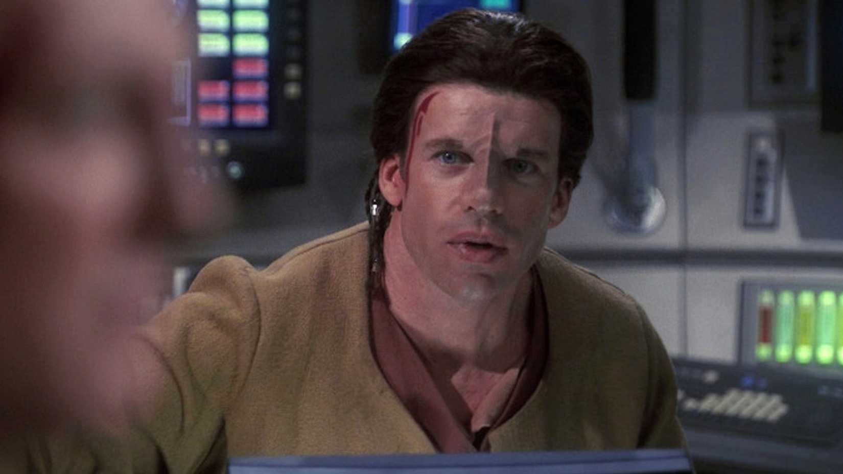 Jareb, played by Sheridan, only had a small amount of dialogue, mostly to provide background information. (This limited role might have influenced Taylor’s later writing style, leading him to avoid excessive exposition.) In Star Trek: Enterprise, Jareb’s purpose was to assist D’Jamat in seizing control of the Enterprise bridge, and he physically fought with Subcommander T’Pol, played by Jolene Blalock.