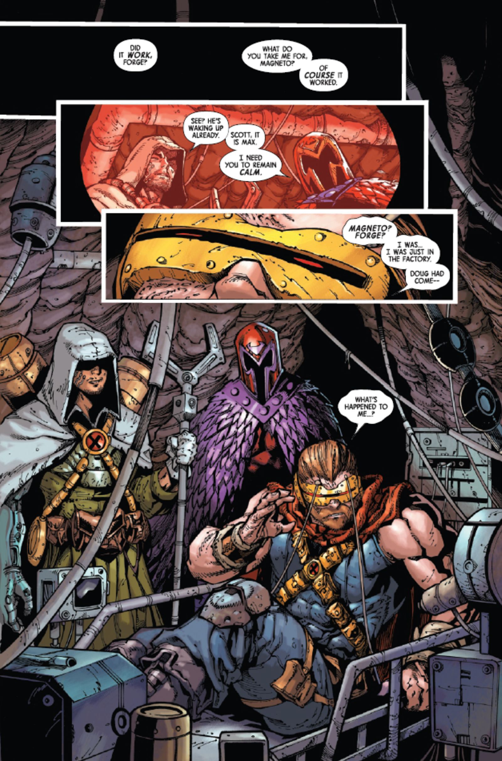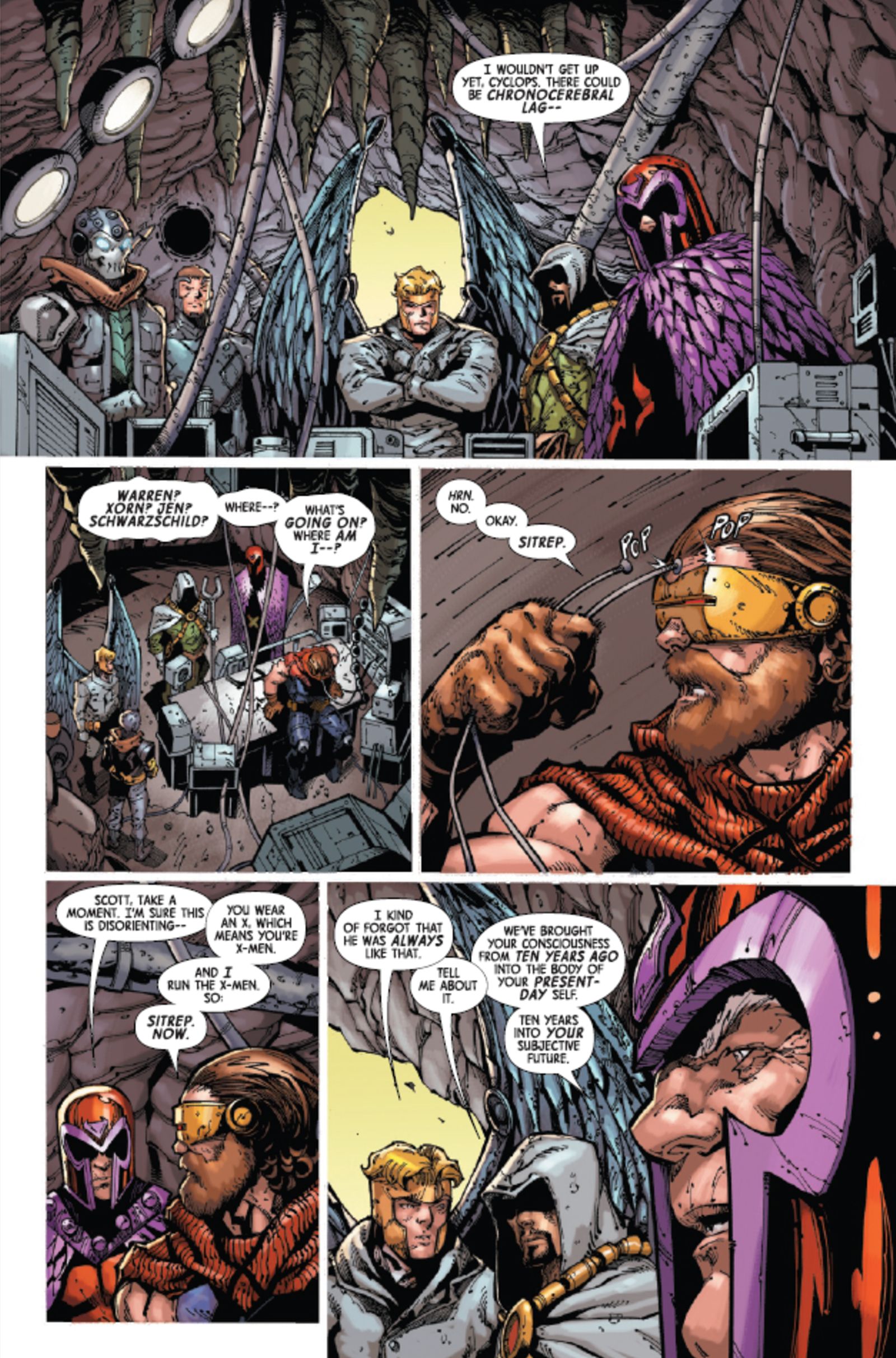 A sneak peek at X-Men: Age of Revelation Overture #1 (written by Jed MacKay, with art by Ryan Stegman, FP Mayer, Edgar Delgado, and lettering by VC’s Clayton Cowles) from Marvel Comics starts by showing an older Cyclops waking up to find his mutant teammates gathered around him. It’s revealed that this Cyclops has the memories of his future self, brought back in time from ten years ahead, hoping he can change the outcome of the fight against Revelation. However, it won’t be simple, as Revelation has already largely won the war.