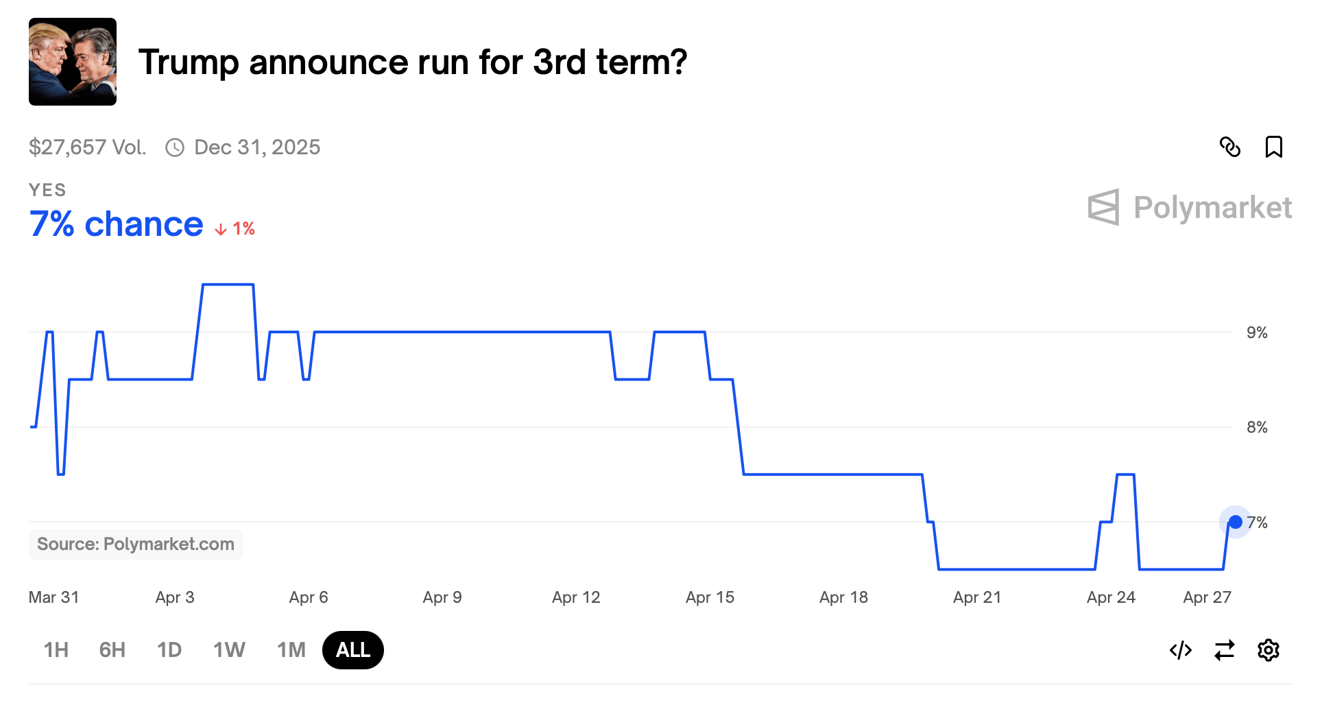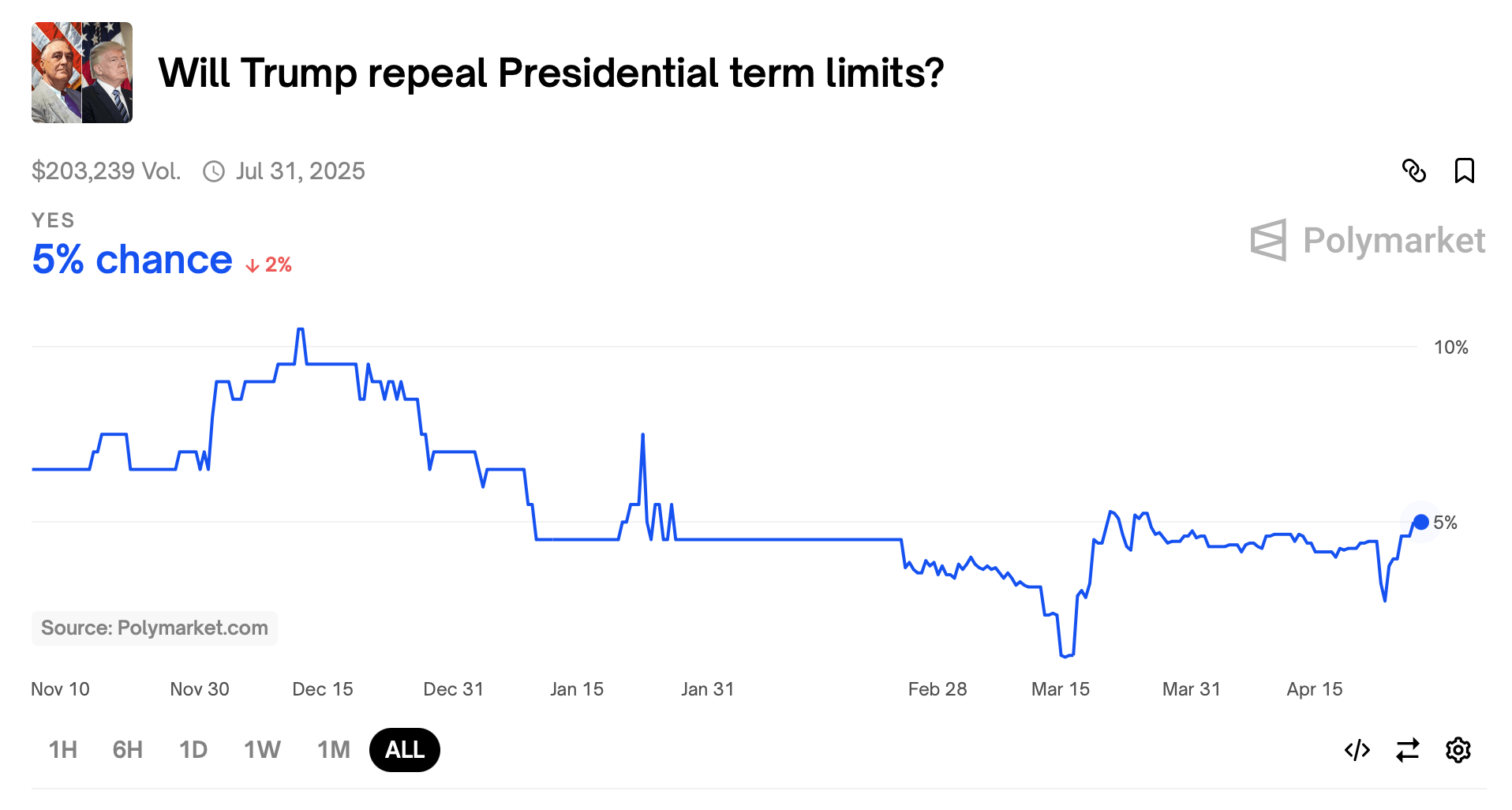 On Polymarket, the odds are even more… let’s say, *realistic*. A wager there, which has a $27,657 trading volume (because why not spend your money on the impossible?), gives Trump a 7% shot at going for that third term. At least, they were more optimistic in early April when it reached 10%. Another $203,239 bet asks if Trump will just outright repeal the term limit amendment. The chances of that? Oh, a solid 5%, which is, you know, still more likely than me winning the lottery.
