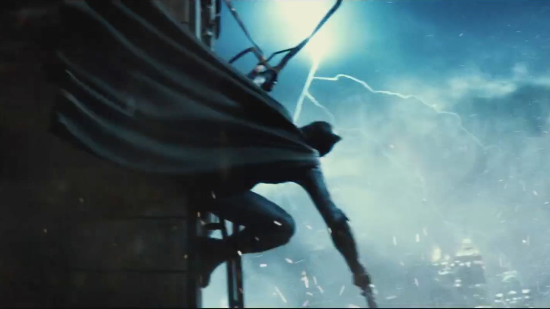 Despite the title suggesting a connection, the movie Batman v Superman doesn’t actually follow the story of The Dark Knight Returns very closely. The main similarity is the fight between Batman and Superman, and even then, it’s mostly visual. Bruce Wayne’s armored Batsuit in that fight is inspired by the one in the graphic novel, but it’s a more streamlined design. Later in the film, there’s a more subtle reference: during the battle with Doomsday, Batman strikes a pose on a building that directly copies the famous cover image of The Dark Knight Returns, complete with a dramatic lightning silhouette.