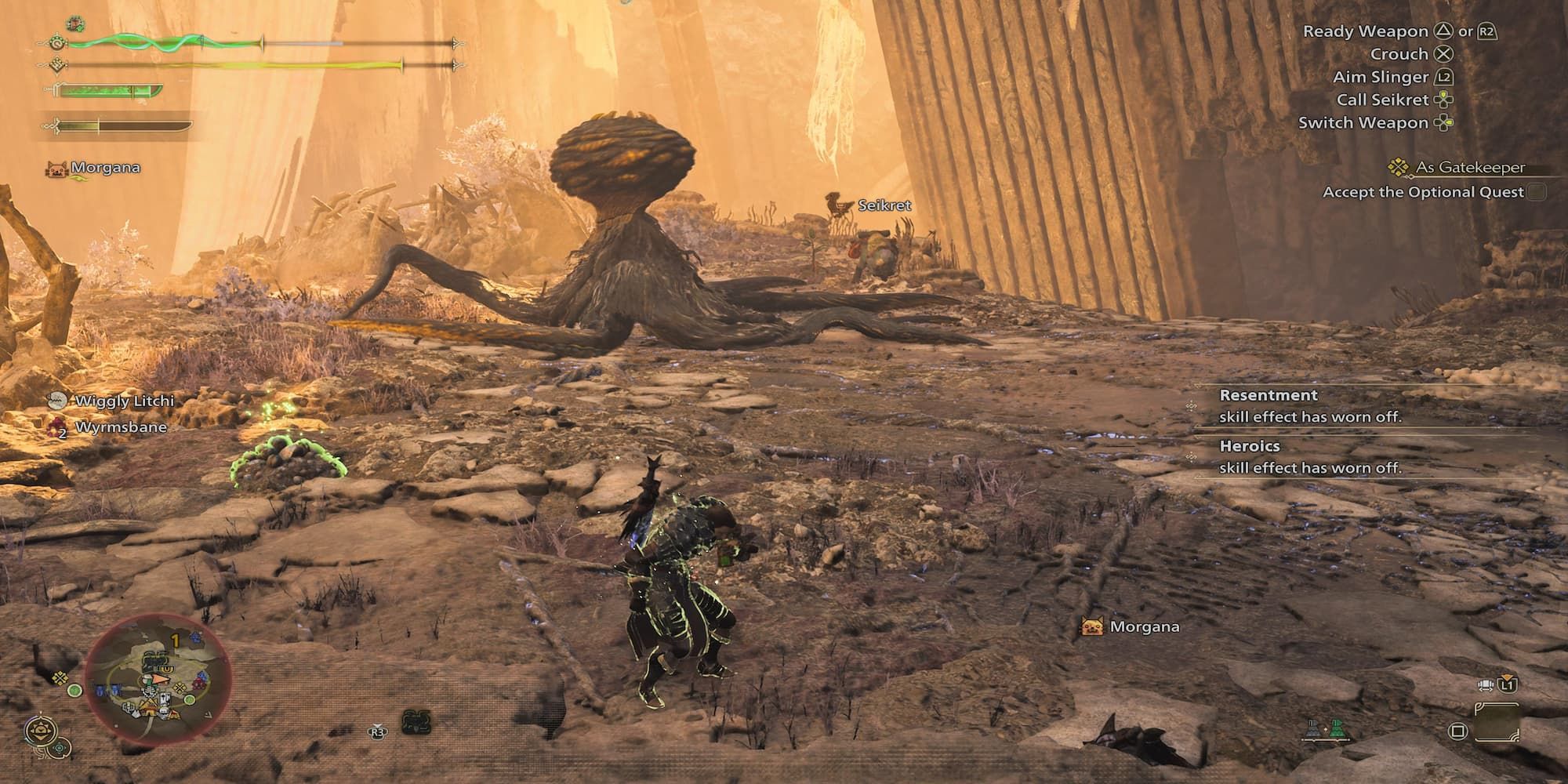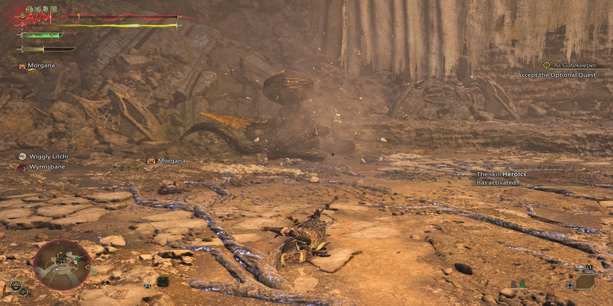 heroics kicks in when your health falls below 35%, which means a monster only needs to deal a few hits to trigger it. Once activated, this ability persists until your health surpasses the 35% mark. On your health meter, you’ll notice a slim line signifying the 35% limit, resembling a thin number ‘4’. You’ll receive a message informing you that the skill is active, accompanied by buffs displayed in the top left corner of the screen, depending on the level of the skill.